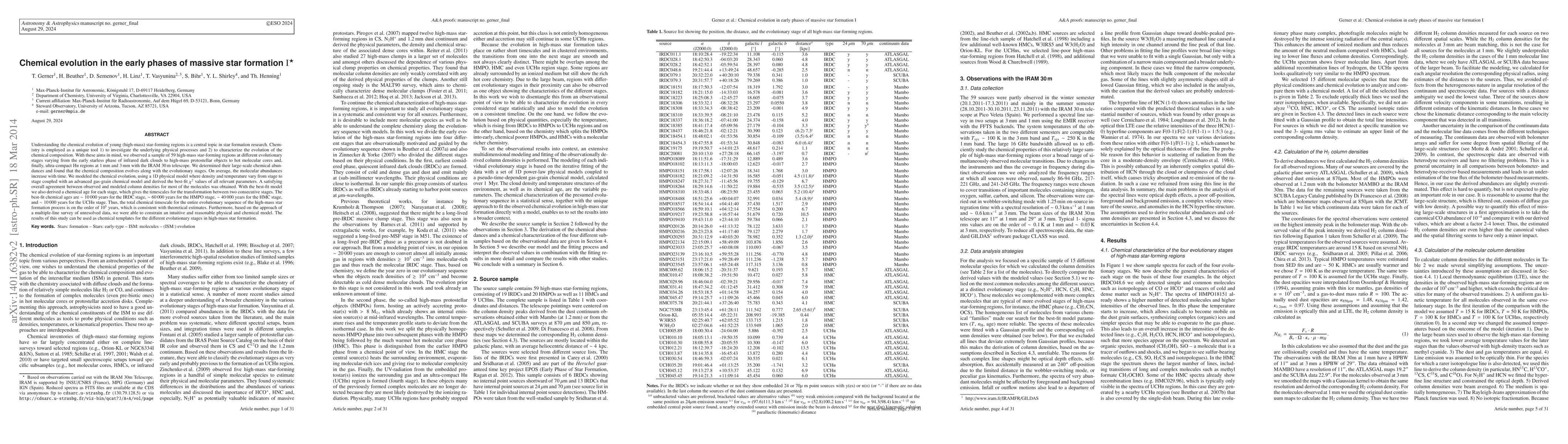Understanding the chemical evolution of young (high-mass) star-forming regions is a central topic in star formation research. Chemistry is employed as a unique tool 1) to investigate the underlying physical processes and 2) to characterize the evolution of the chemical composition. We observed a sample of 59 high-mass star-forming regions at different evolutionary stages varying from the early starless phase of infrared dark clouds to high-mass protostellar objects to hot molecular cores and, finally, ultra-compact HII regions at 1mm and 3mm with the IRAM 30m telescope. We determined their large-scale chemical abundances and found that the chemical composition evolves along with the evolutionary stages. On average, the molecular abundances increase with time. We modeled the chemical evolution, using a 1D physical model where density and temperature vary from stage to stage coupled with an advanced gas-grain chemical model and derived the best-fit chi^2 values of all relevant parameters. A satisfying overall agreement between observed and modeled column densities for most of the molecules was obtained. With the best-fit model we also derived a chemical age for each stage, which gives the timescales for the transformation between two consecutive stages. The best-fit chemical ages are ~10,000 years for the IRDC stage, ~60,000 years for the HMPO stage, ~40,000 years for the HMC stage, and ~10,000 years for the UCHII stage. The total chemical timescale for the entire evolutionary sequence of the high-mass star formation process is on the order of 10^5 years, which is consistent with theoretical estimates. Furthermore, based on the approach of a multiple-line survey of unresolved data, we were able to constrain an intuitive and reasonable physical and chemical model. The results of this study can be used as chemical templates for the different evolutionary stages in high-mass star formation.
