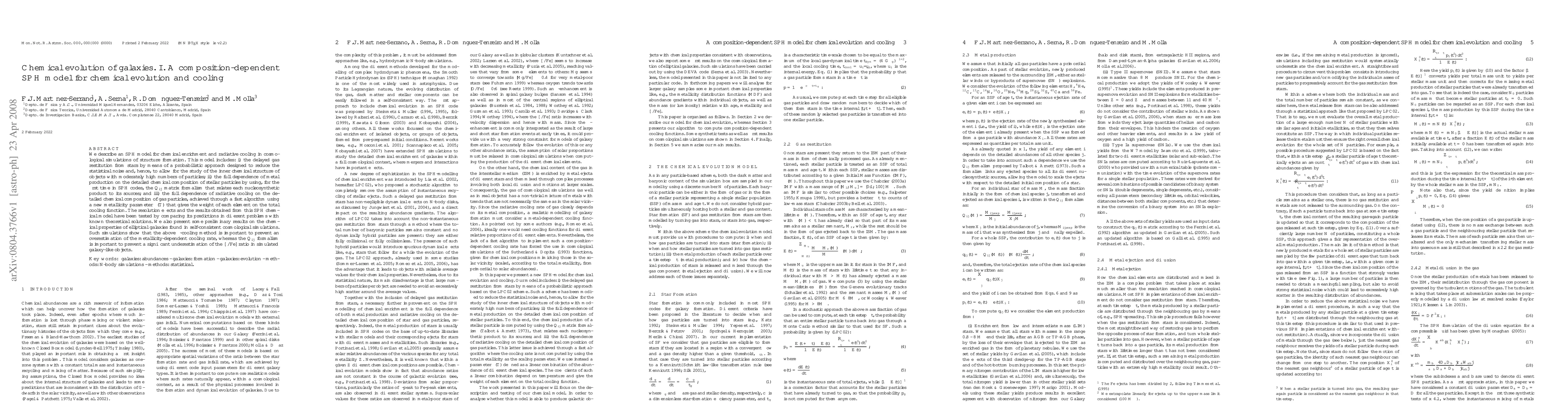 This paper introduces a novel Smoothed Particle Hydrodynamics (SPH) model for chemical evolution and radiative cooling in cosmological simulations, incorporating a probabilistic approach for delayed gas restitution, a Qij matrix formalism for metal production, and a new zeta(T) metallicity parameter for radiative cooling. The model's effectiveness is demonstrated through comparisons with theoretical solutions and preliminary results on elliptical galaxies.