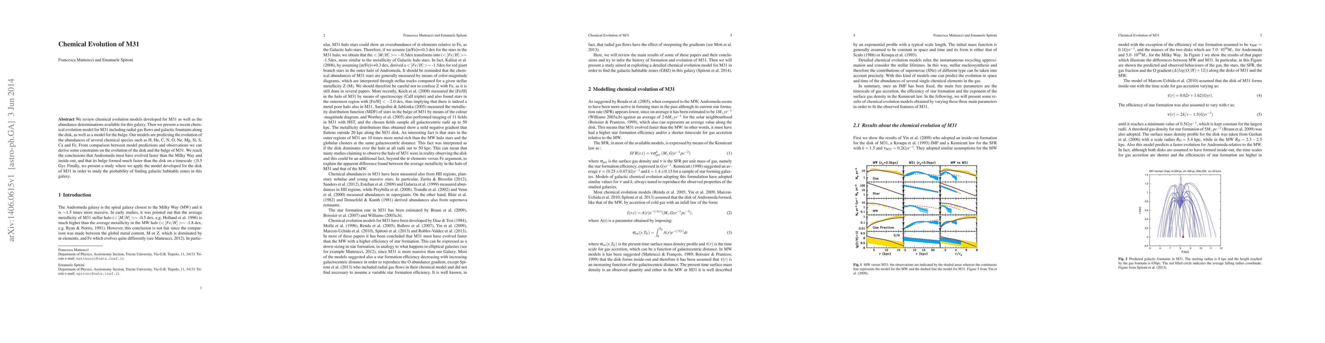 This paper reviews chemical evolution models for M31 and presents a new model incorporating radial gas flows and galactic fountains, predicting the evolution of various chemical species. The study concludes that M31 evolved faster than the Milky Way, with its bulge forming much faster than the disk, and explores the potential for habitable zones in M31.