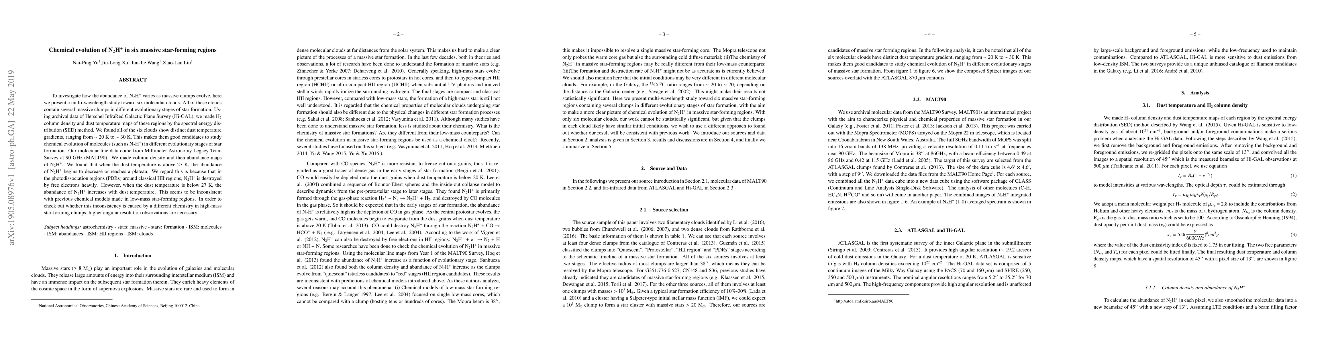 This study investigates the chemical evolution of N2H+ in six massive star-forming regions using multi-wavelength data from Hi-GAL and MALT90. The research found that N2H+ abundance decreases or plateaus above 27 K, suggesting destruction by free electrons in photodissociation regions, while it increases below 27 K, inconsistent with low-mass star-forming models, necessitating higher resolution observations for further analysis.