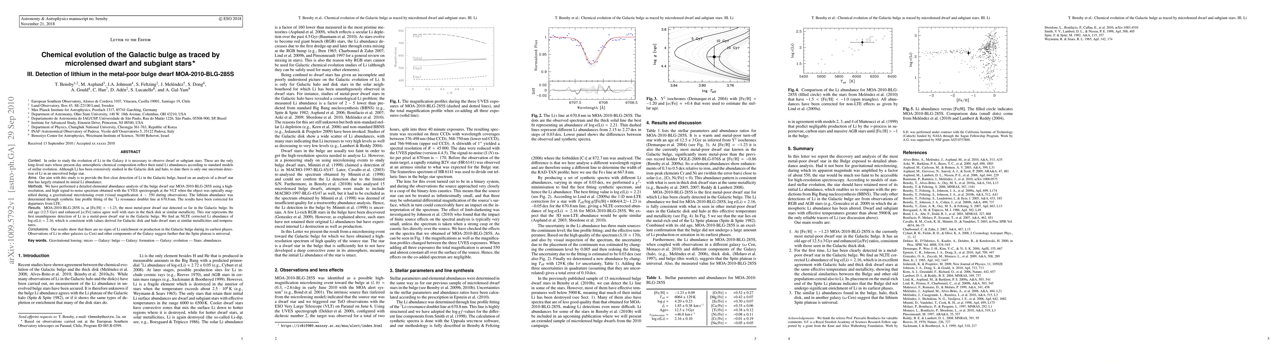 This study provides the first clear detection of lithium in a metal-poor dwarf star in the Galactic bulge, MOA-2010-BLG-285S, using high-resolution spectroscopy during a microlensing event. The findings suggest no lithium enrichment in the bulge during its early phases, supporting the universality of the Spite plateau.