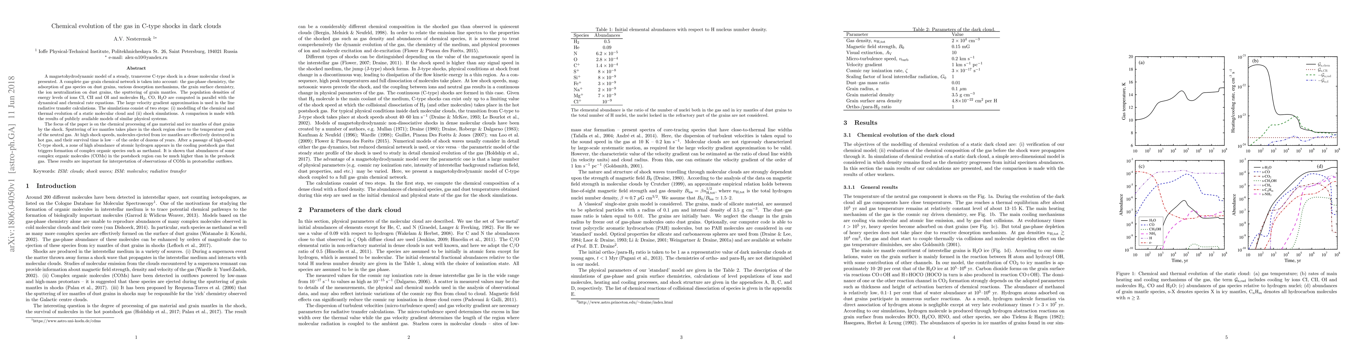 A magnetohydrodynamic model of a steady, transverse C-type shock in a dense molecular cloud is presented. A complete gas-grain chemical network is taken into account: the gas-phase chemistry, the adsorption of gas species on dust grains, various desorption mechanisms, the grain surface chemistry, the ion neutralization on dust grains, the sputtering of grain mantles. The population densities of energy levels of ions CI, CII and OI and molecules H$_2$, CO, H$_2$O are computed in parallel with the dynamical and chemical rate equations. The large velocity gradient approximation is used in the line radiative transfer calculations. The simulations consist of two steps: (i) modelling of the chemical and thermal evolution of a static molecular cloud and (ii) shock simulations. A comparison is made with the results of publicly available models of similar physical systems. The focus of the paper is on the chemical processing of gas material and ice mantles of dust grains by the shock. Sputtering of ice mantles takes place in the shock region close to the temperature peak of the neutral gas. At high shock speeds, molecules ejected from ice mantles are effectively destroyed in hot gas, and their survival time is low - of the order of dozens of years. After a passage of high-speed C-type shock, a zone of high abundance of atomic hydrogen appears in the cooling postshock gas that triggers formation of complex organic species such as methanol. It is shown that abundances of some complex organic molecules (COMs) in the postshock region can be much higher than in the preshock gas. These results are important for interpretation of observations of COMs in protostellar outflows.