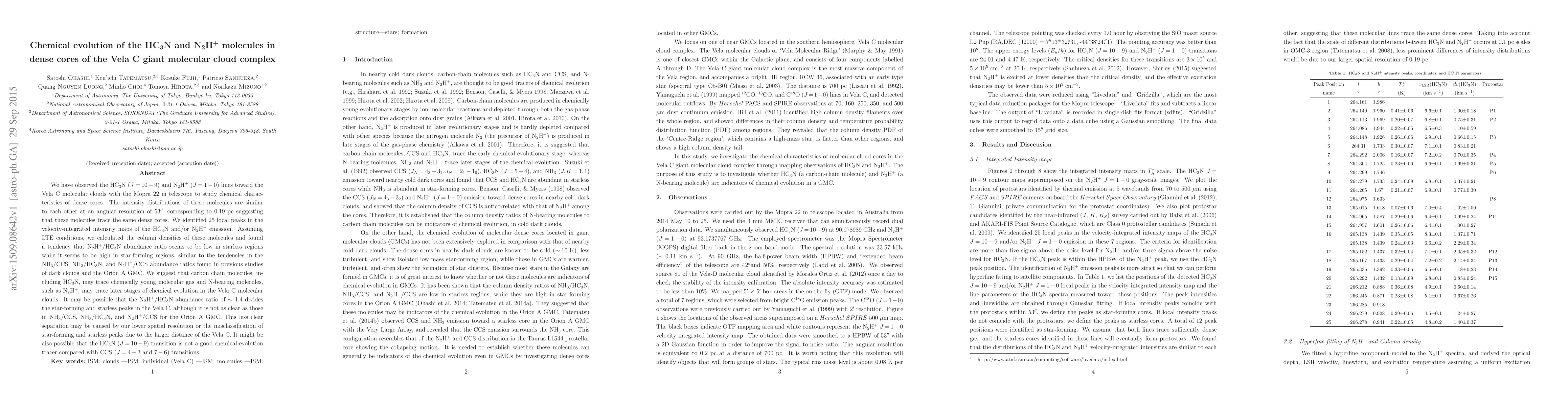 This study observes HC3N and N2H+ lines in the Vela C molecular cloud to trace chemical evolution, finding similar intensity distributions suggesting they mark the same dense cores. The N2H+/HC3N ratio is low in starless regions and high in star-forming regions, indicating that HC3N traces young gas while N2H+ marks later stages of chemical evolution.