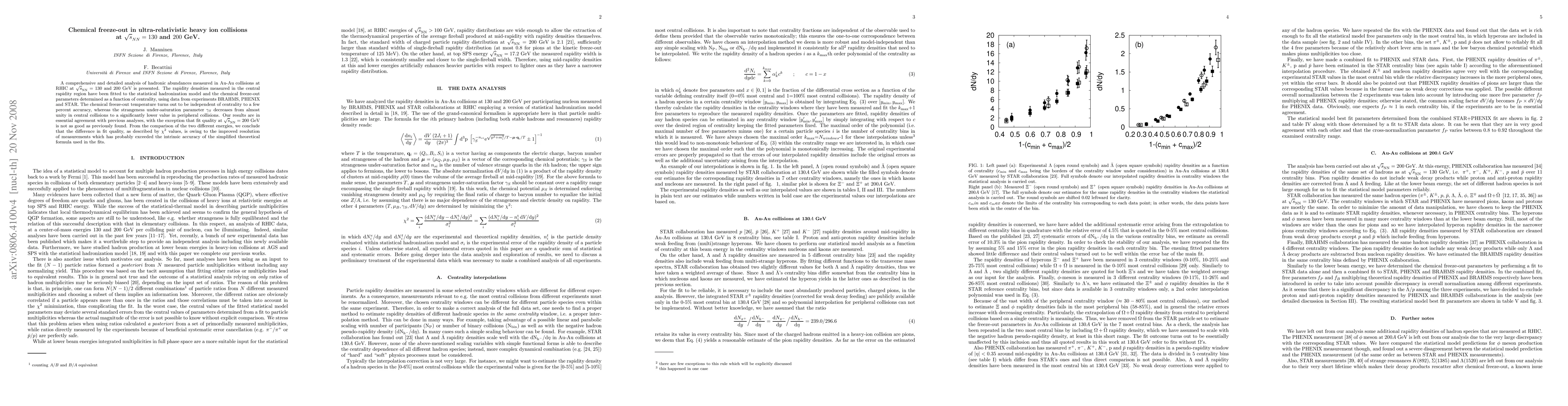A comprehensive and detailed analysis of hadronic abundances measured in Au-Au collisions at RHIC at sqrt(s)_NN = 130 and 200 GeV is presented. The rapidity densities measured in the central rapidity region have been fitted to the statistical hadronization model and the chemical freeze-out parameters determined as a function of centrality, using data from experiments BRAHMS, PHENIX and STAR. The chemical freeze-out temperature turns out to be independent of centrality to a few percent accuracy, whereas the strangeness under-saturation parameter gamma_S decreases from almost unity in central collisions to a significantly lower value in peripheral collisions. Our results are in essential agreement with previous analyses, with the exception that fit quality at sqrt(s)_NN = 200 GeV is not as good as previously found. From the comparison of the two different energies, we conclude that the difference in fit quality, as described by chi2 values, is owing to the improved resolution of measurements which has probably exceeded the intrinsic accuracy of the simplified theoretical formula used in the fits.