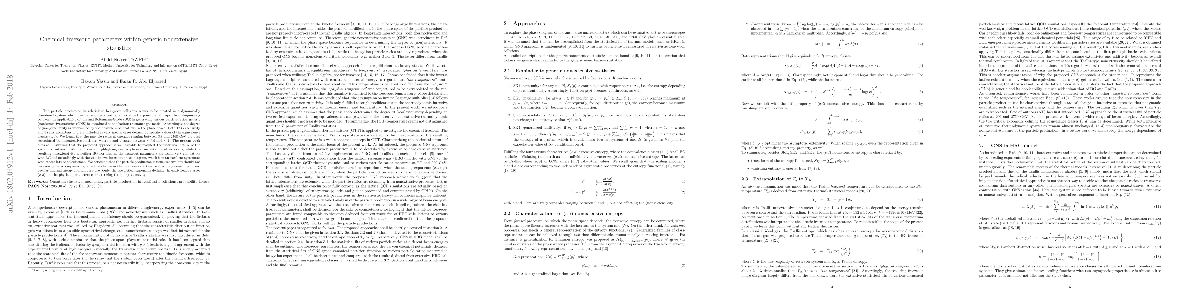 This paper explores the use of generic nonextensive statistics (GNS) to describe particle production in relativistic heavy-ion collisions, finding that nonextensive statistics better reproduces particle ratios across a wide range of energies compared to Boltzmann-Gibbs statistics. The study concludes that while the system exhibits nonextensive behavior, the freezeout parameters remain consistent with traditional thermodynamic models.