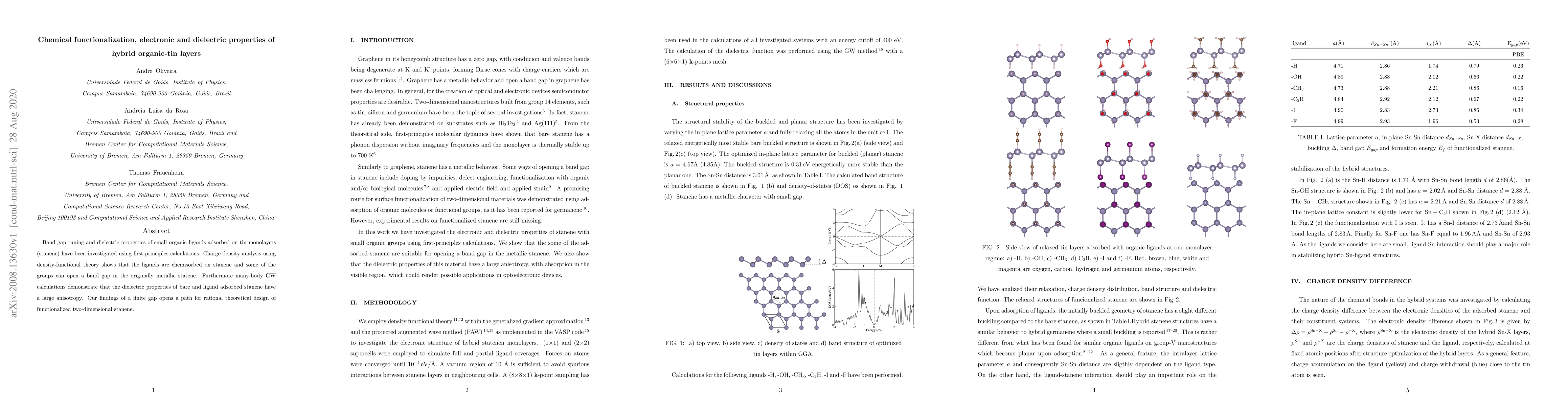 Band gap tuning and dielectric properties of small organic ligands adsorbed on tin monolayers (stanene) have been investigated using first-principles calculations. Charge density analysis using density-functional theory shows that the ligands are chemisorbed on stanene and some of the groups can open a band gap in the originally metallic statene. Furthermore many-body GW calculations demonstrate that the dielectric properties of bare and ligand adsorbed stanene have a large anisotropy. Our findings of a finite gap opens a path for rational theoretical design of functionalized two-dimensional stanene.