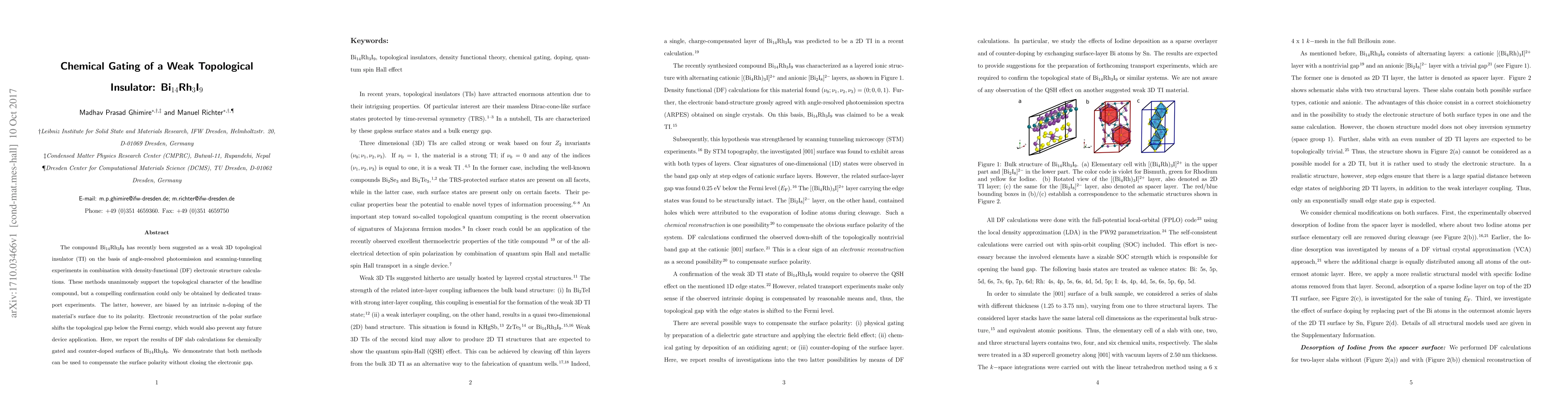 This paper investigates the topological properties of Bi14Rh3I9, confirming its weak topological insulator status through various experiments and calculations. The study finds that chemical gating and counter-doping can compensate for surface polarity-induced n-doping, maintaining the electronic gap and potential device applications.