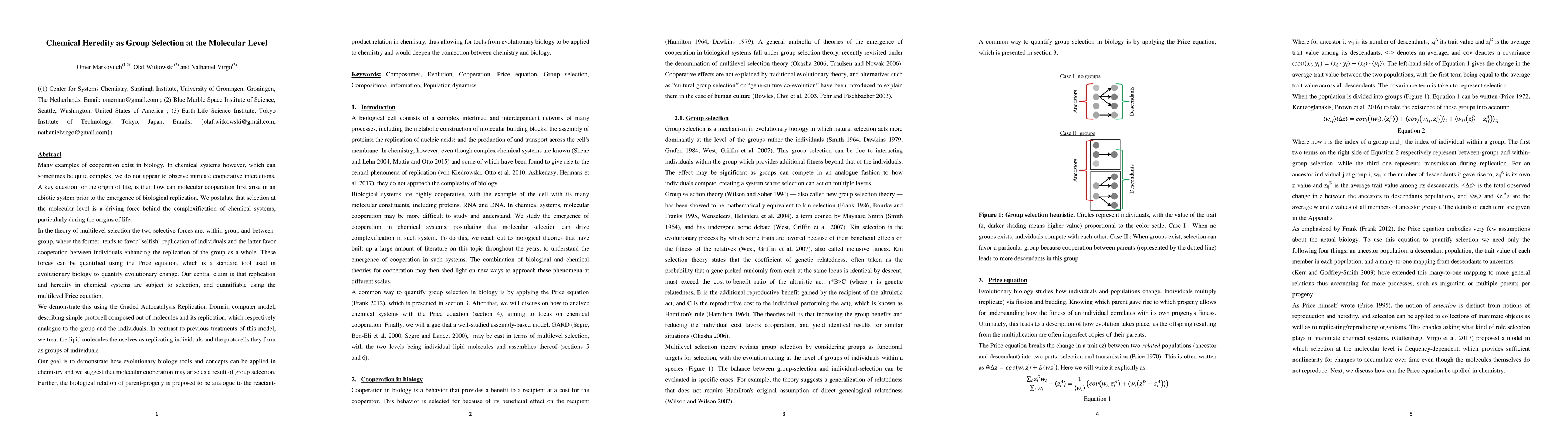 Many examples of cooperation exist in biology. In chemical systems however, which can sometimes be quite complex, we do not appear to observe intricate cooperative interactions. A key question for the origin of life, is then how can molecular cooperation first arise in an abiotic system prior to the emergence of biological replication. We postulate that selection at the molecular level is a driving force behind the complexification of chemical systems, particularly during the origins of life. In the theory of multilevel selection the two selective forces are: within-group and between-group, where the former tends to favor "selfish" replication of individuals and the latter favor cooperation between individuals enhancing the replication of the group as a whole. These forces can be quantified using the Price equation, which is a standard tool used in evolutionary biology to quantify evolutionary change. Our central claim is that replication and heredity in chemical systems are subject to selection, and quantifiable using the multilevel Price equation. We demonstrate this using the Graded Autocatalysis Replication Domain computer model, describing simple protocell composed out of molecules and its replication, which respectively analogue to the group and the individuals. In contrast to previous treatments of this model, we treat the lipid molecules themselves as replicating individuals and the protocells they form as groups of individuals. Our goal is to demonstrate how evolutionary biology tools and concepts can be applied in chemistry and we suggest that molecular cooperation may arise as a result of group selection. Further, the biological relation of parent-progeny is proposed to be analogue to the reactant-product relation in chemistry, thus allowing for tools from evolutionary biology to be applied to chemistry and would deepen the connection between chemistry and biology.