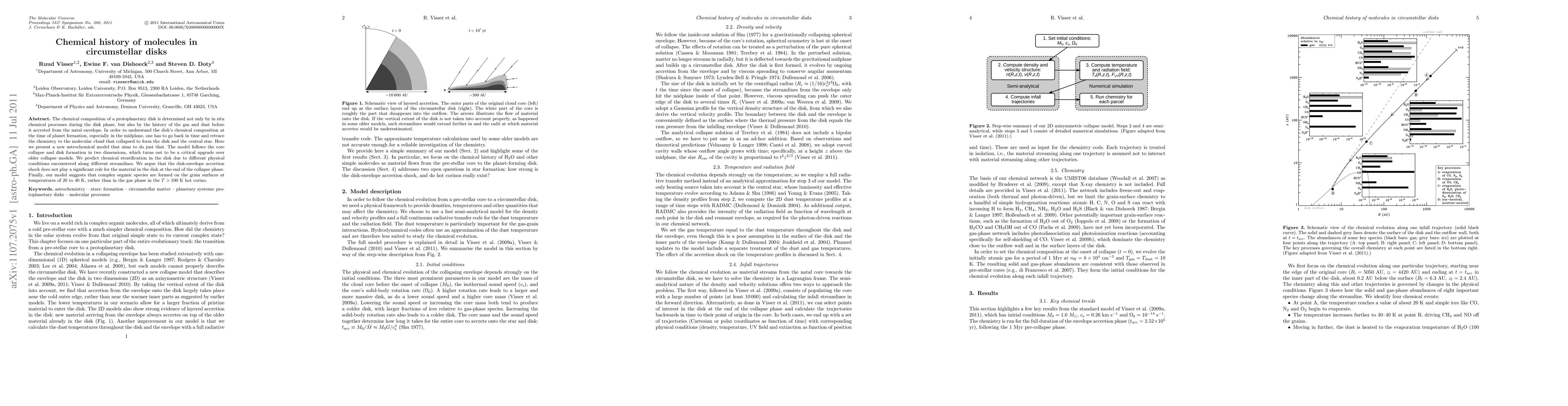 The chemical composition of a protoplanetary disk is determined not only by in situ chemical processes during the disk phase, but also by the history of the gas and dust before it accreted from the natal envelope. In order to understand the disk's chemical composition at the time of planet formation, especially in the midplane, one has to go back in time and retrace the chemistry to the molecular cloud that collapsed to form the disk and the central star. Here we present a new astrochemical model that aims to do just that. The model follows the core collapse and disk formation in two dimensions, which turns out to be a critical upgrade over older collapse models. We predict chemical stratification in the disk due to different physical conditions encountered along different streamlines. We argue that the disk-envelope accretion shock does not play a significant role for the material in the disk at the end of the collapse phase. Finally, our model suggests that complex organic species are formed on the grain surfaces at temperatures of 20 to 40 K, rather than in the gas phase in the T>100 K hot corino.