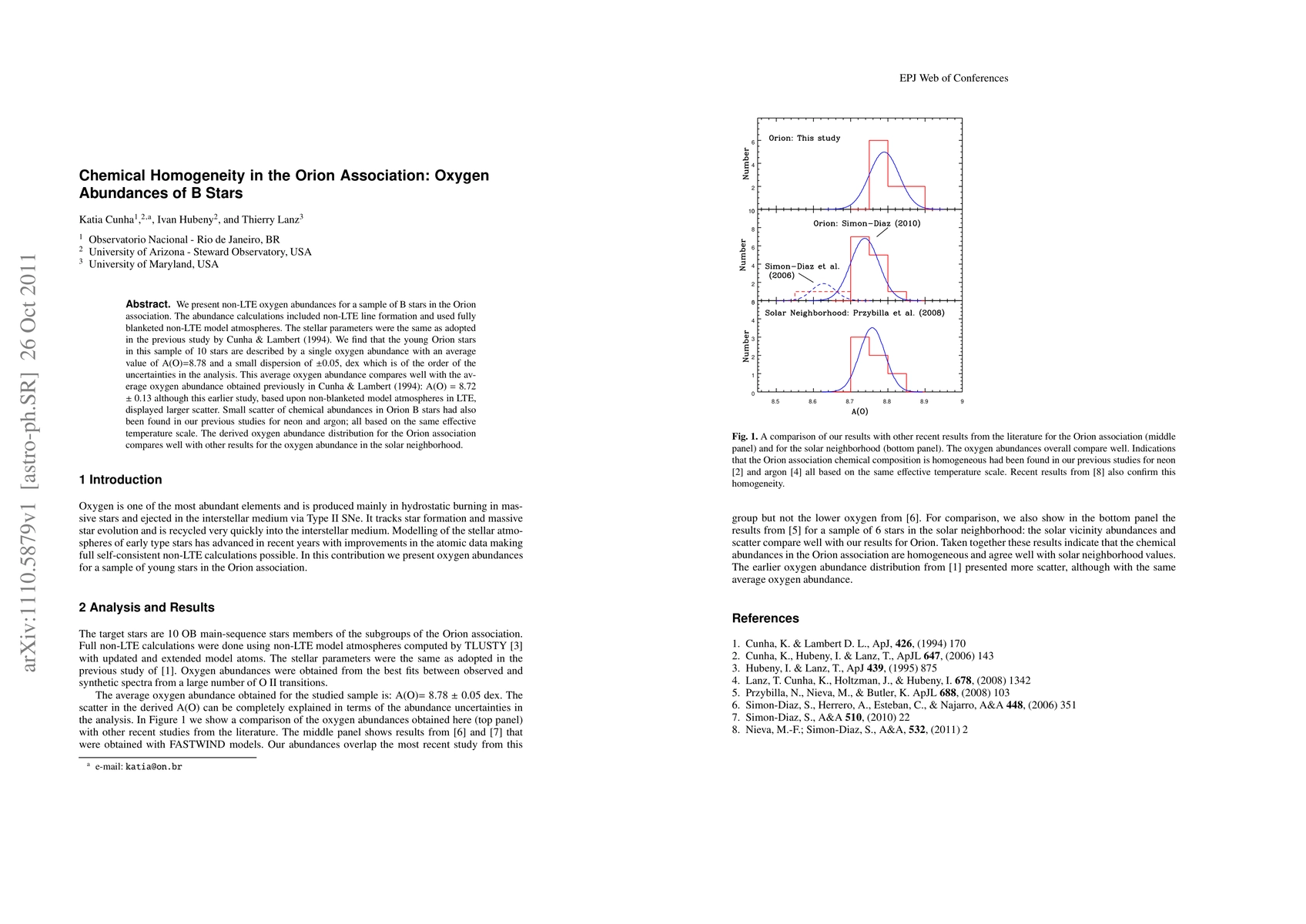 We present non-LTE oxygen abundances for a sample of B stars in the Orion association. The abundance calculations included non-LTE line formation and used fully blanketed non-LTE model atmospheres. The stellar parameters were the same as adopted in the previous study by Cunha & Lambert (1994). We find that the young Orion stars in this sample of 10 stars are described by a single oxygen abundance with an average value of A(O)=8.78 and a small dispersion of +/- 0.05 dex, which is of the order of the uncertainties in the analysis. This average oxygen abundance compares well with the average oxygen abundance obtained previously in Cunha & Lambert (1994): A(O) = 8.72 +/- 0.13 although this earlier study, based upon non-blanketed model atmospheres in LTE, displayed larger scatter. Small scatter of chemical abundances in Orion B stars had also been found in our previous studies for neon and argon; all based on the same effective temperature scale. The derived oxygen abundance distribution for the Orion association compares well with other results for the oxygen abundance in the solar neighborhood.
