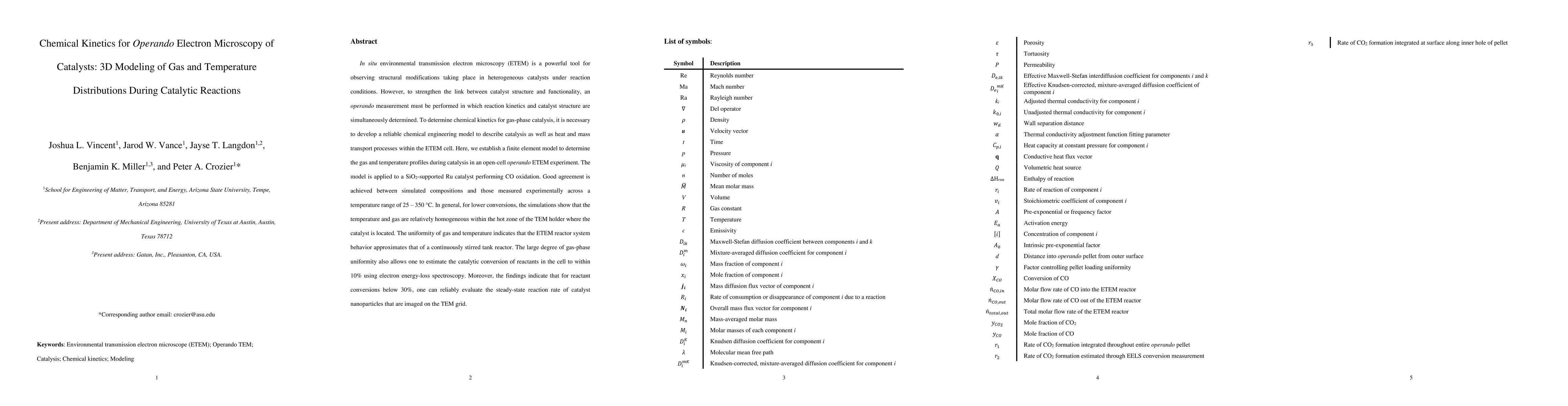 $\textit{In situ}$ environmental transmission electron microscopy (ETEM) is a powerful tool for observing structural modifications taking place in heterogeneous catalysts under reaction conditions. However, to strengthen the link between catalyst structure and functionality, an $\textit{operando}$ measurement must be performed in which reaction kinetics and catalyst structure are simultaneously determined. To determine chemical kinetics for gas-phase catalysis, it is necessary to develop a reliable chemical engineering model to describe catalysis as well as heat and mass transport processes within the ETEM cell. Here, we establish a finite element model to determine the gas and temperature profiles during catalysis in an open-cell operando ETEM experiment. The model is applied to a $SiO_2$-supported Ru catalyst performing CO oxidation. Good agreement is achieved between simulated compositions and those measured experimentally across a temperature range of 25 - 350 {\deg}C. In general, for lower conversions, the simulations show that the temperature and gas are relatively homogeneous within the hot zone of the TEM holder where the catalyst is located. The uniformity of gas and temperature indicates that the ETEM reactor system behavior approximates that of a continuously stirred tank reactor. The large degree of gas-phase uniformity also allows one to estimate the catalytic conversion of reactants in the cell to within 10 percent using electron energy-loss spectroscopy. Moreover, the findings indicate that for reactant conversions below 30 percent, one can reliably evaluate the steady-state reaction rate of catalyst nanoparticles that are imaged on the TEM grid.