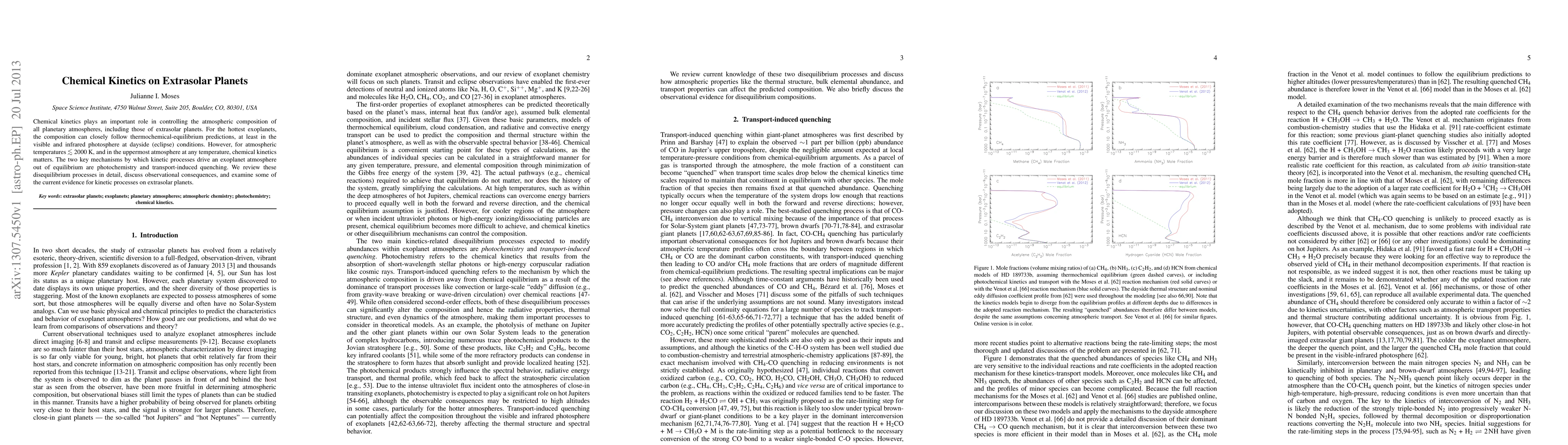 Research finds that chemical kinetics plays a crucial role in shaping atmospheric composition on extrasolar planets, especially at temperatures below 2000K. Key mechanisms of photochemistry and transport-induced quenching drive these processes, with implications for understanding planetary atmospheres.