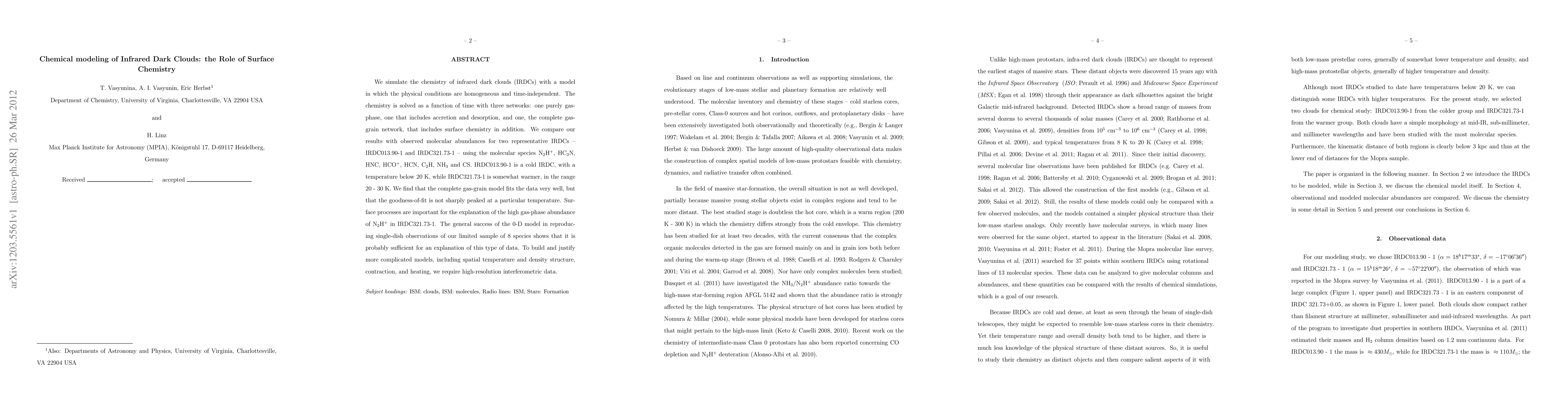 This study simulates the chemical processes in infrared dark clouds (IRDCs) using gas-phase, gas-grain, and complete gas-grain models, finding that the latter best fits observed molecular abundances. Surface chemistry significantly explains the high N$_2$H$^+$ abundance in warmer IRDCs, suggesting its importance in these environments.