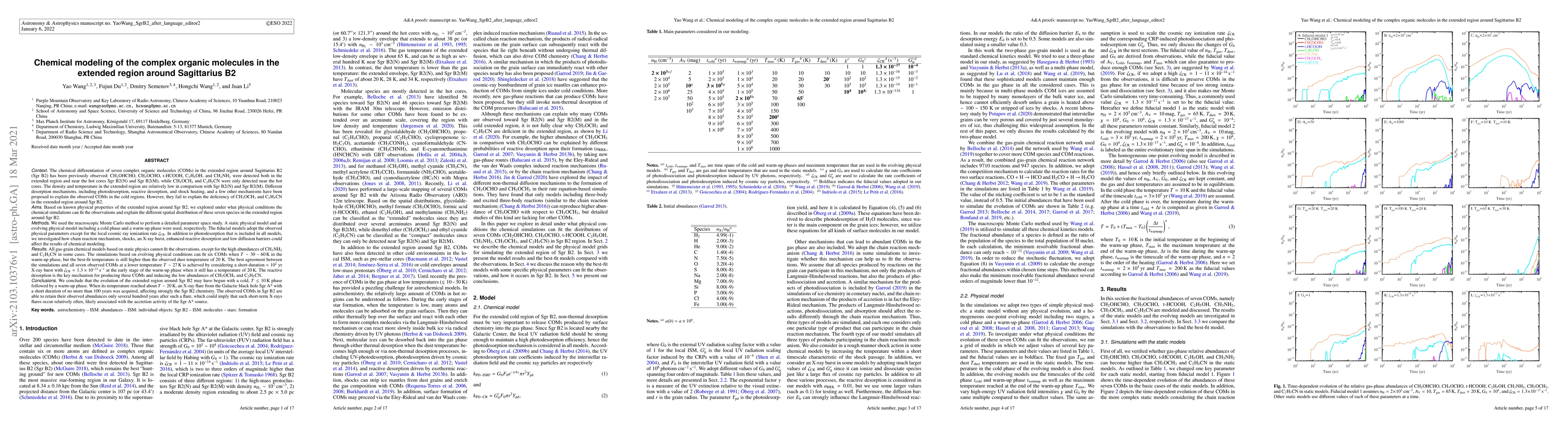 Researchers used chemical modeling to study complex organic molecules in the extended region around Sagittarius B2, finding that a short X-ray flare is necessary to explain their observed abundances, with temperatures ranging from 20-60 K.