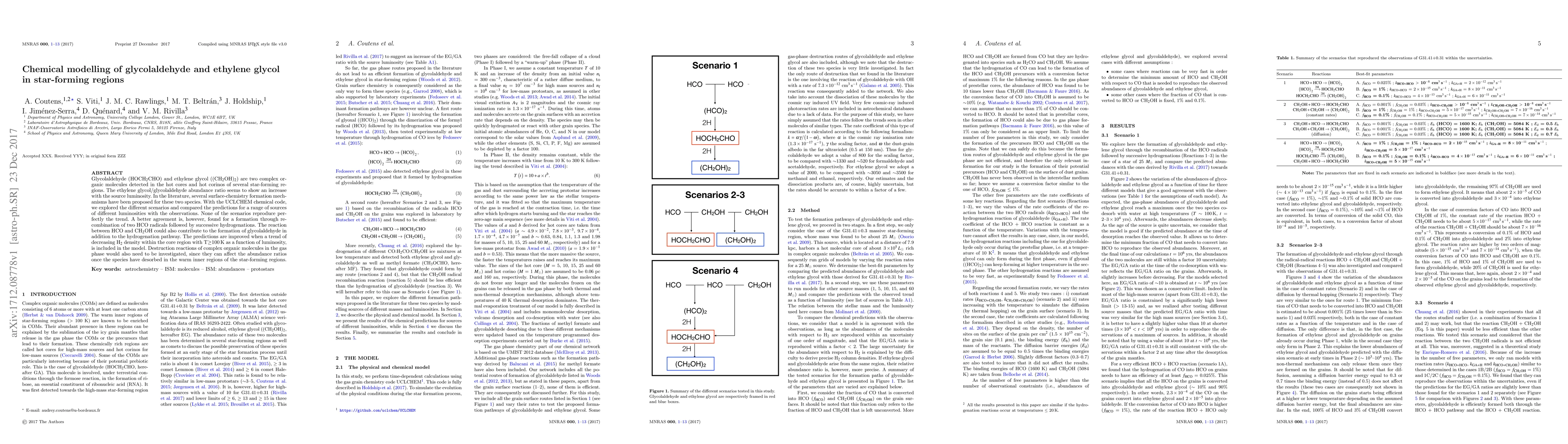 This paper investigates the chemical pathways for glycolaldehyde and ethylene glycol formation in star-forming regions using the UCLCHEM code, finding that recombination of HCO radicals followed by hydrogenation offers the best fit to observed abundance ratios. The study highlights the need for considering gas-phase destruction reactions to fully understand these complex organic molecules' behavior.