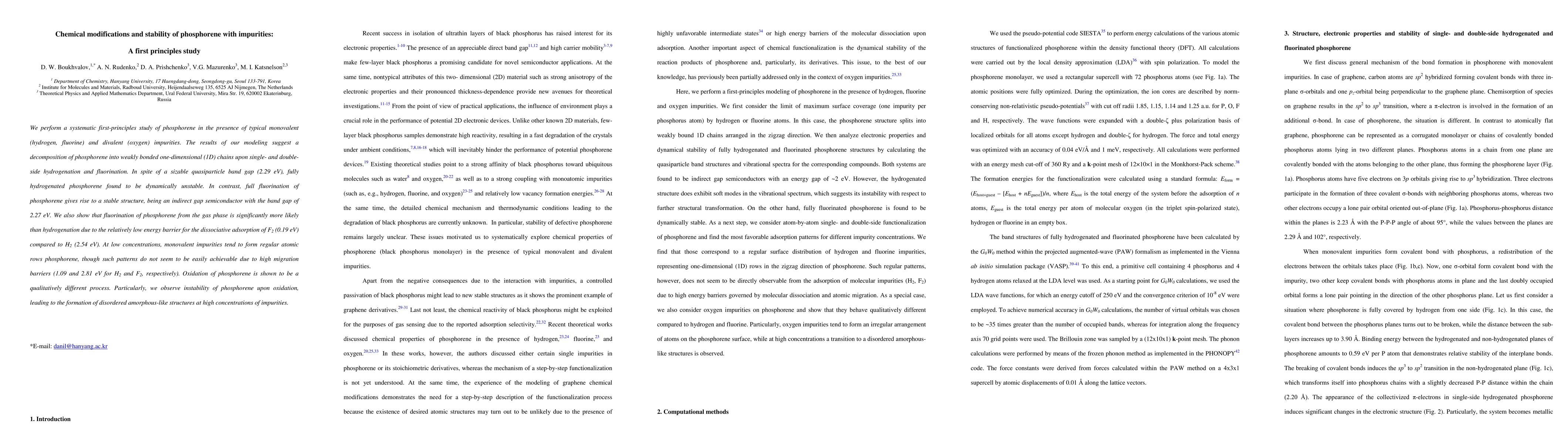 This study investigates the chemical stability and modifications of phosphorene when exposed to monovalent (H, F) and divalent (O) impurities using first-principles calculations. It finds that hydrogenation and fluorination lead to decomposition into 1D chains and stable structures, respectively, while oxidation results in instability and amorphous formations.
