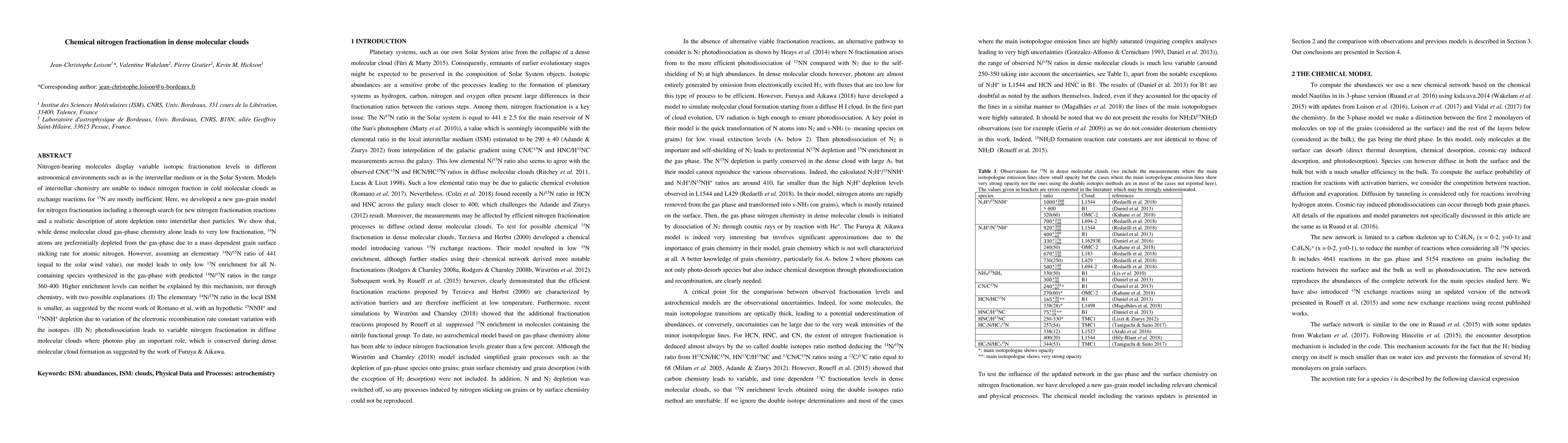 New gas-grain model explains how nitrogen fractionation occurs in dense molecular clouds, leading to low levels of 15N enrichment in N-containing species, with possible explanations including variations in the local ISM or photon-induced photodissociation.