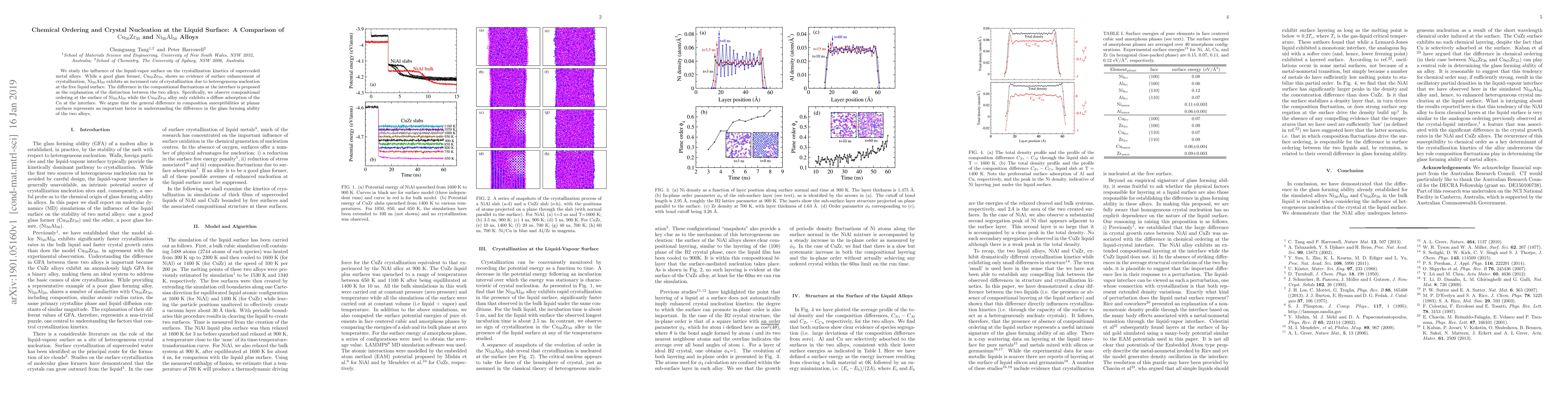 This study compares the crystallization kinetics of $\rm{Cu}_{50}\rm{Zr}_{50}$ and $\rm{Ni}_{50}\rm{Al}_{50}$ alloys at the liquid-vapor interface, finding that $\rm{Ni}_{50}\rm{Al}_{50}$ exhibits enhanced crystallization due to surface-induced nucleation, while $\rm{Cu}_{50}\rm{Zr}_{50}$ does not, suggesting compositional differences at the interface play a key role in their differing glass-forming abilities.