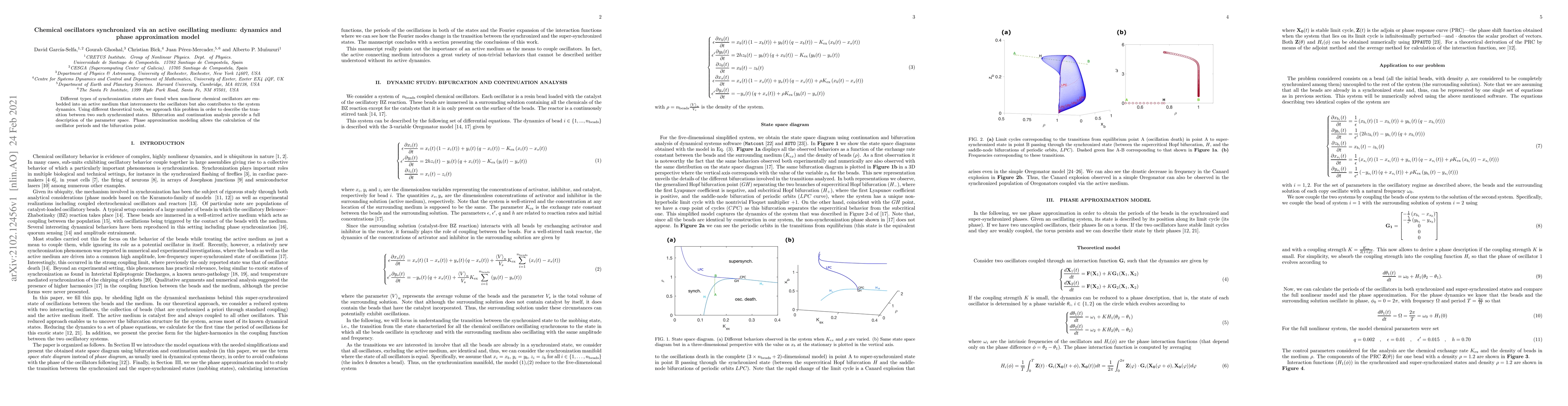 This paper investigates the synchronization dynamics of non-linear chemical oscillators within an active medium, revealing various synchronization states. It employs bifurcation and continuation analysis to map the parameter space and uses phase approximation modeling to determine oscillator periods and bifurcation points.
