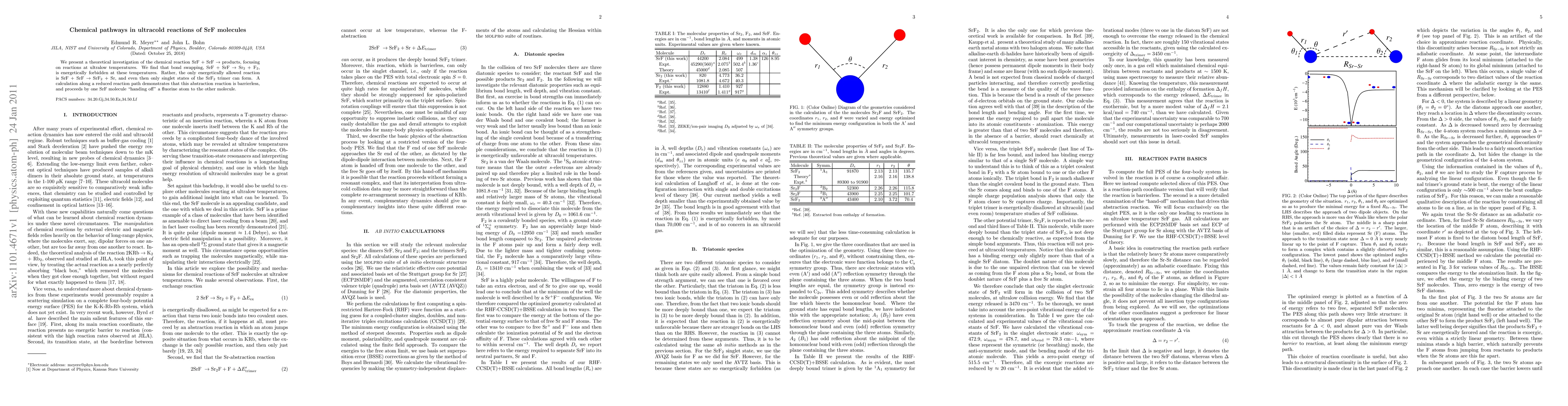 We present a theoretical investigation of the chemical reaction SrF + SrF $\rightarrow$ products, focusing on reactions at ultralow temperatures. We find that bond swapping, SrF + SrF $\rightarrow$ Sr$_2$ + F$_2$, is energetically forbidden at these temperatures. Rather, the only energetically allowed reaction is SrF + SrF $\rightarrow$ SrF$_2$ + Sr, and even then only singlet states of the SrF$_2$ trimer can form. A calculation along a reduced reaction path demonstrates that this abstraction reaction is barrierless, and proceeds by one SrF molecule "handing off" a fluorine atom to the other molecule.