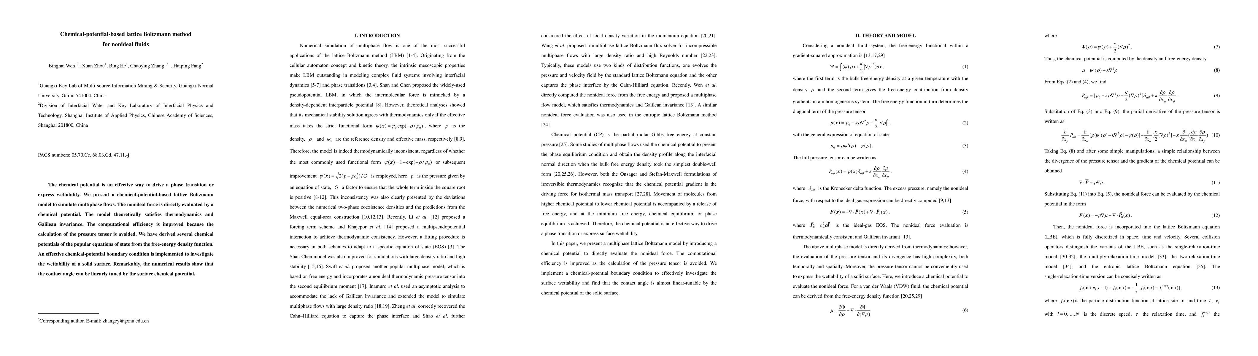 This paper introduces a chemical-potential-based lattice Boltzmann method for simulating nonideal fluid multiphase flows, ensuring thermodynamic consistency and Galilean invariance. The model enhances computational efficiency by bypassing pressure tensor calculations and demonstrates tunable wettability via surface chemical potential, showing linear contact angle adjustment.