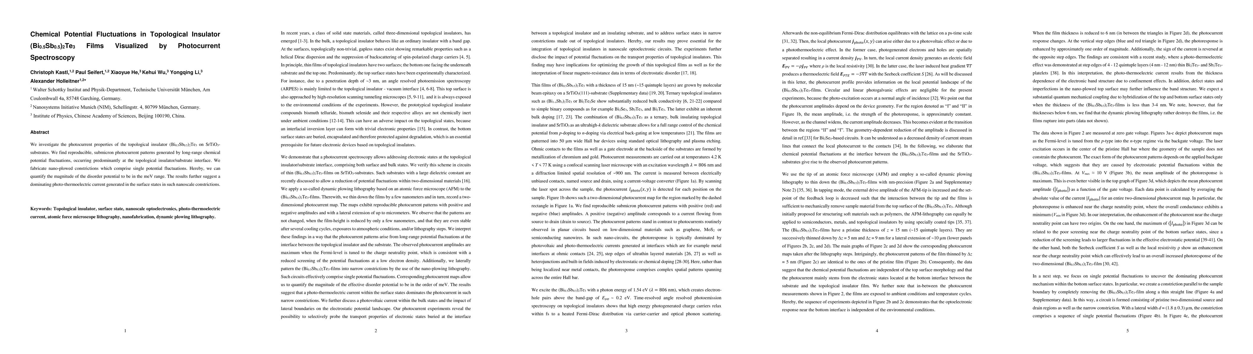This study investigates photocurrent properties in (Bi$_{0.5}$Sb$_{0.5}$)$_2$Te$_3$ films on SrTiO$_3$ substrates, revealing submicron patterns driven by long-range chemical potential fluctuations, primarily at the interface. The research quantifies these fluctuations in the meV range and suggests a significant photo-thermoelectric current in surface states within nanoscale constrictions.