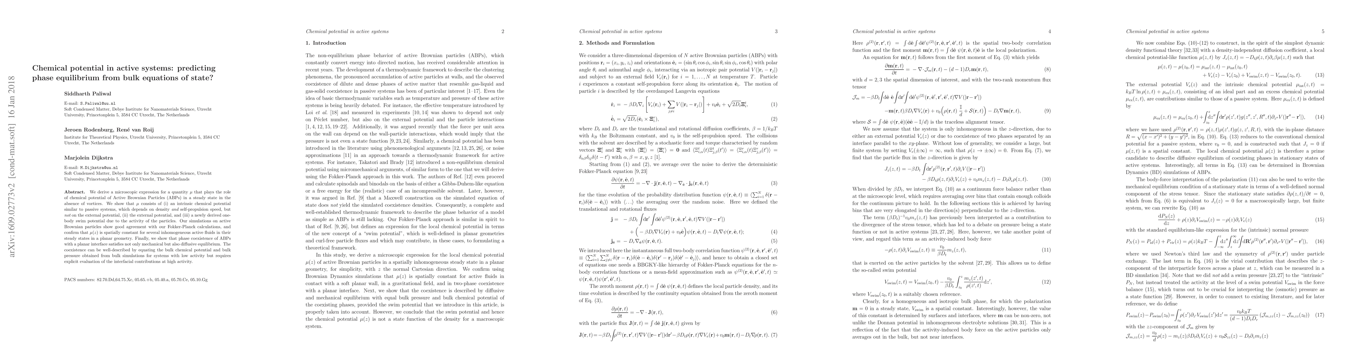 We derive a microscopic expression for a quantity $\mu$ that plays the role of chemical potential of Active Brownian Particles (ABPs) in a steady state in the absence of vortices. We show that $\mu$ consists of (i) an intrinsic chemical potential similar to passive systems, which depends on density and self-propulsion speed, but not on the external potential, (ii) the external potential, and (iii) a newly derived one-body swim potential due to the activity of the particles. Our simulations on active Brownian particles show good agreement with our Fokker-Planck calculations, and confirm that $\mu(z)$ is spatially constant for several inhomogeneous active fluids in their steady states in a planar geometry. Finally, we show that phase coexistence of ABPs with a planar interface satisfies not only mechanical but also diffusive equilibrium. The coexistence can be well-described by equating the bulk chemical potential and bulk pressure obtained from bulk simulations for systems with low activity but requires explicit evaluation of the interfacial contributions at high activity.