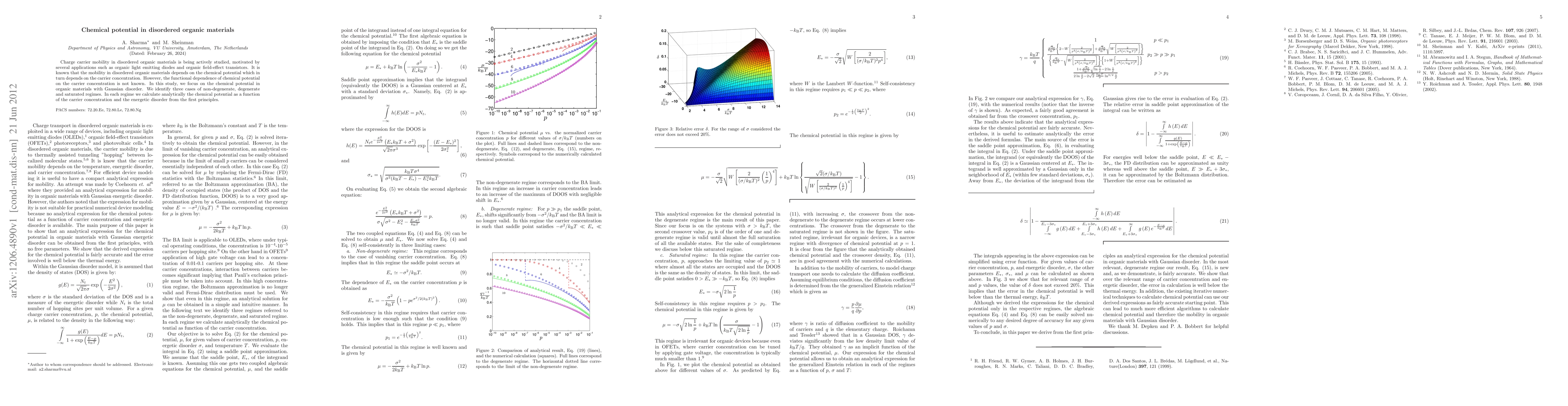 This study investigates the chemical potential in disordered organic materials, identifying three regimes—non-degenerate, degenerate, and saturated—and analytically calculates the chemical potential as a function of carrier concentration and energetic disorder from first principles. The findings provide insights into charge carrier mobility in organic materials.