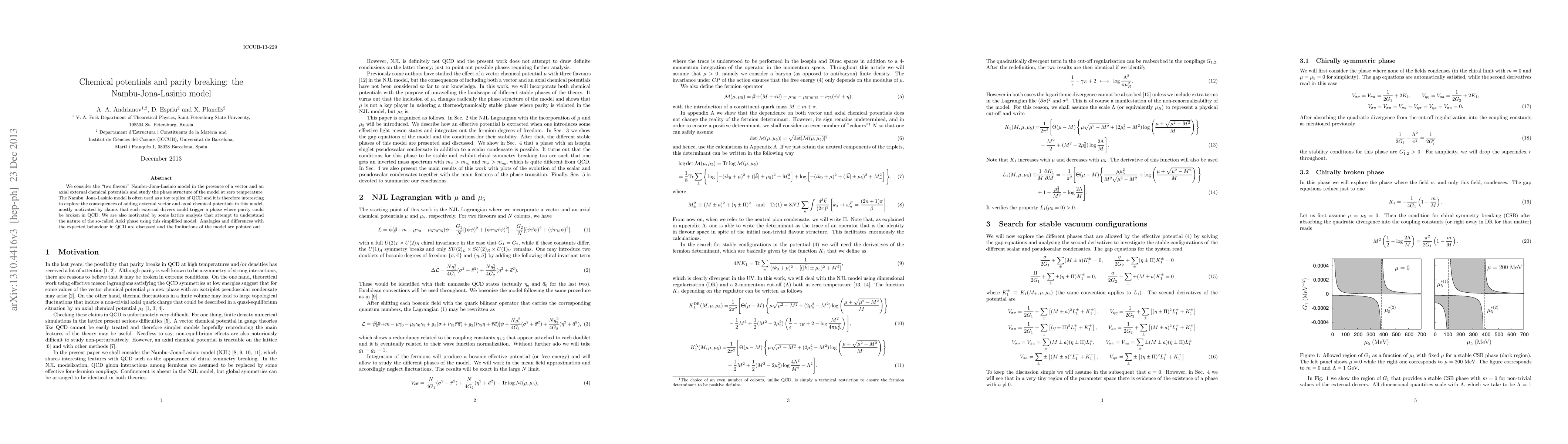 This paper investigates the phase structure of the "two flavour" Nambu-Jona-Lasinio model under vector and axial external chemical potentials at zero temperature, aiming to explore potential parity breaking in QCD. The study highlights analogies and differences with QCD behavior and discusses the model's limitations.