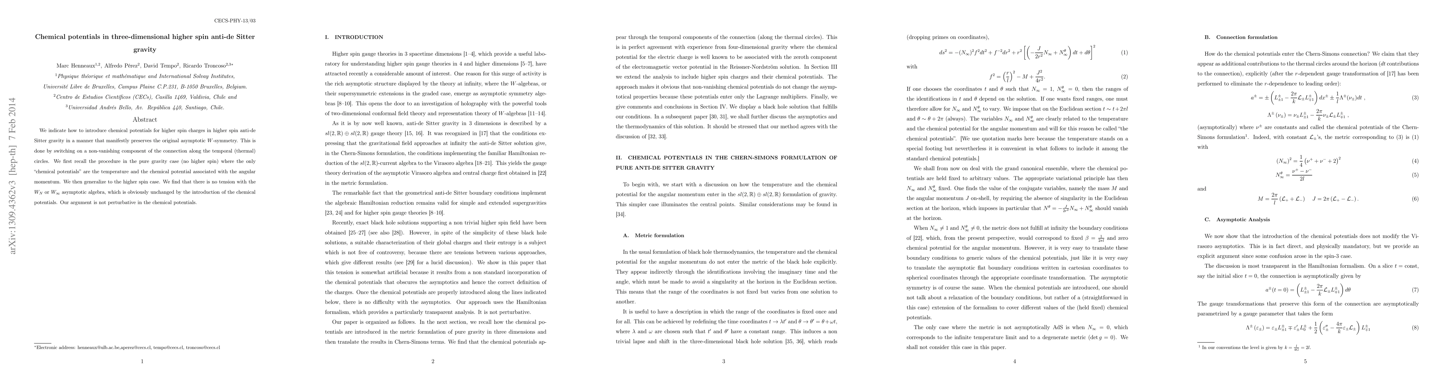 This paper introduces chemical potentials for higher spin charges in three-dimensional higher spin anti-de Sitter gravity, preserving the original asymptotic W-symmetry by activating a non-vanishing connection component along temporal circles. The authors ensure no conflict with the W(N) or W(infinity) asymptotic algebra through a non-perturbative argument.