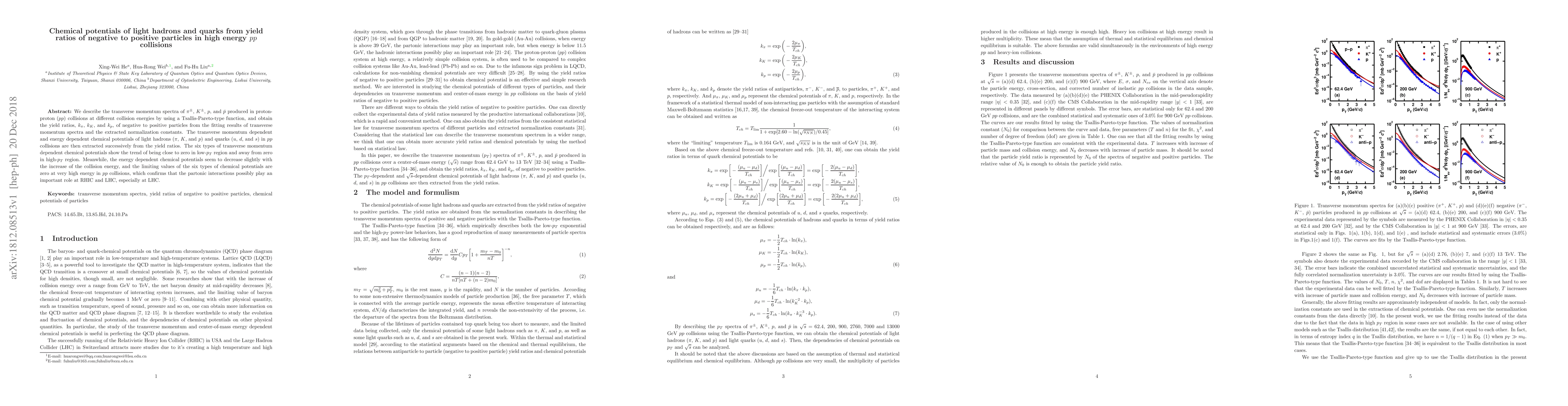 This paper analyzes the transverse momentum spectra of light hadrons and quarks in high-energy proton-proton collisions, extracting chemical potentials using yield ratios. The results show chemical potentials trending towards zero at low transverse momentum and decreasing slightly with higher collision energies, indicating partonic interactions' significance at RHIC and LHC.