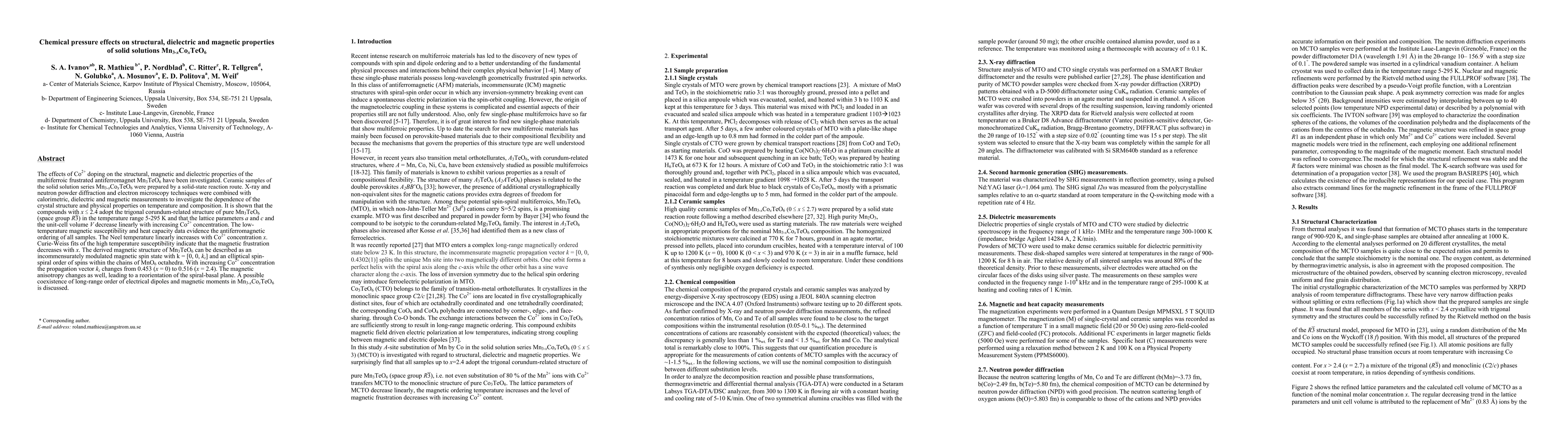 This study investigates the impact of Co2+ doping on the structural, magnetic, and dielectric properties of Mn3TeO6 solid solutions. The results show a linear decrease in lattice parameters and unit-cell volume with increasing Co2+ concentration, while the Neel temperature and magnetic anisotropy increase, leading to a reorientation of the magnetic spin state.