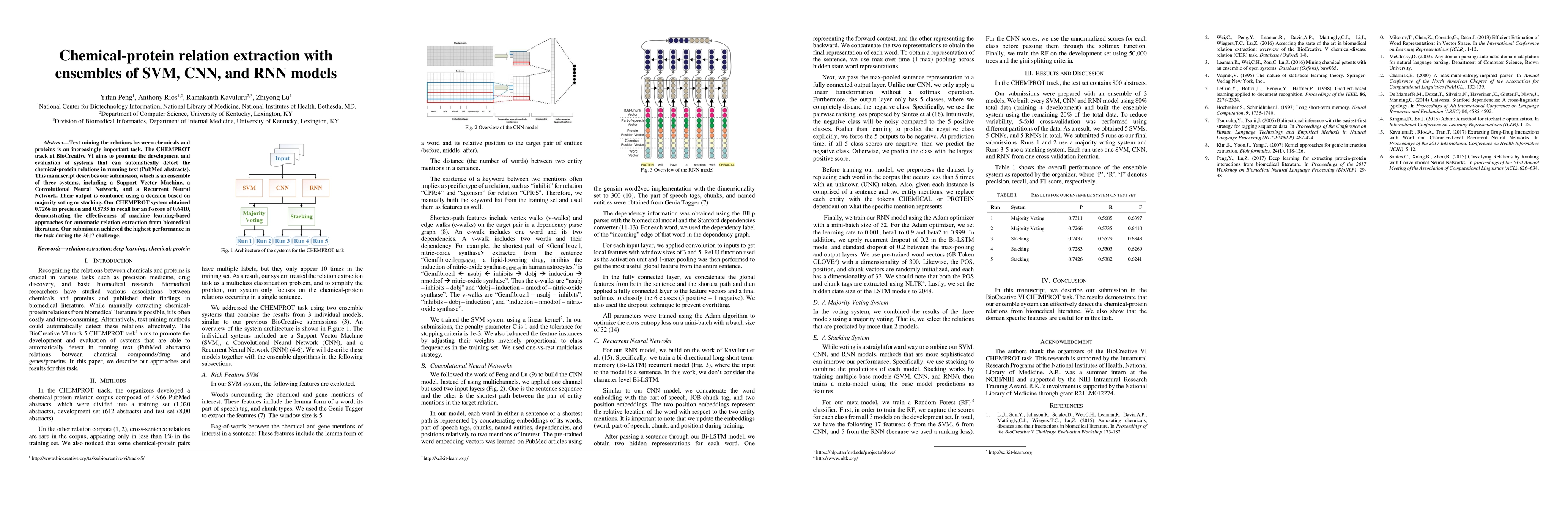 This paper presents an ensemble of SVM, CNN, and RNN models for extracting chemical-protein relations from PubMed abstracts, achieving high precision and recall in the CHEMPROT BioCreative VI challenge. The ensemble's best performance underscores the efficacy of machine learning in biomedical text mining.