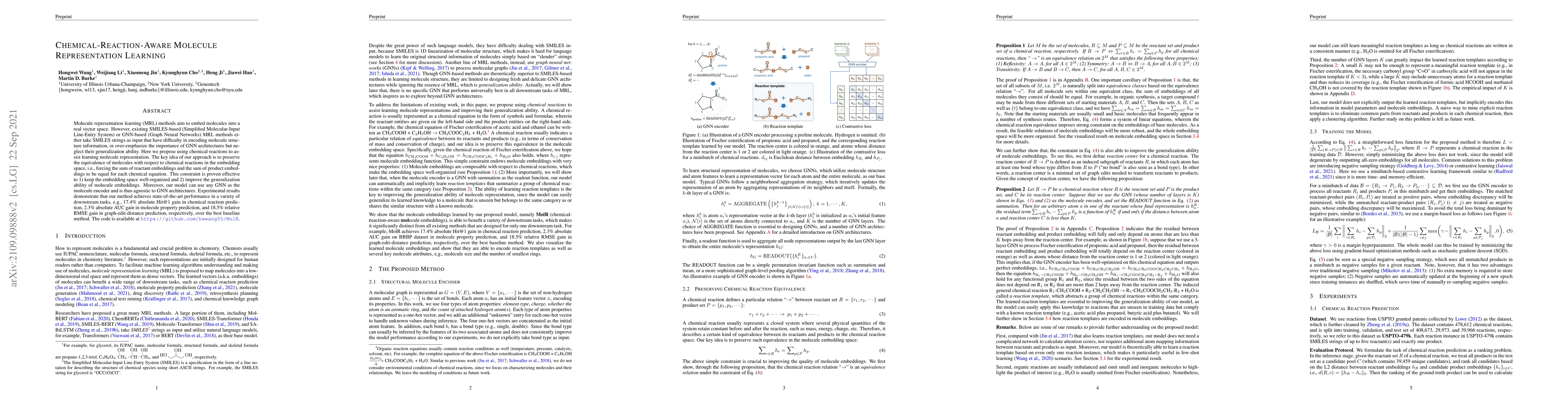 This paper proposes a novel molecule representation learning method that leverages chemical reactions to improve embedding quality. By enforcing the equivalence of reactants and products in chemical equations, the method enhances the organization and generalization of embeddings, achieving state-of-the-art performance in various tasks, including reaction prediction and molecule property prediction.