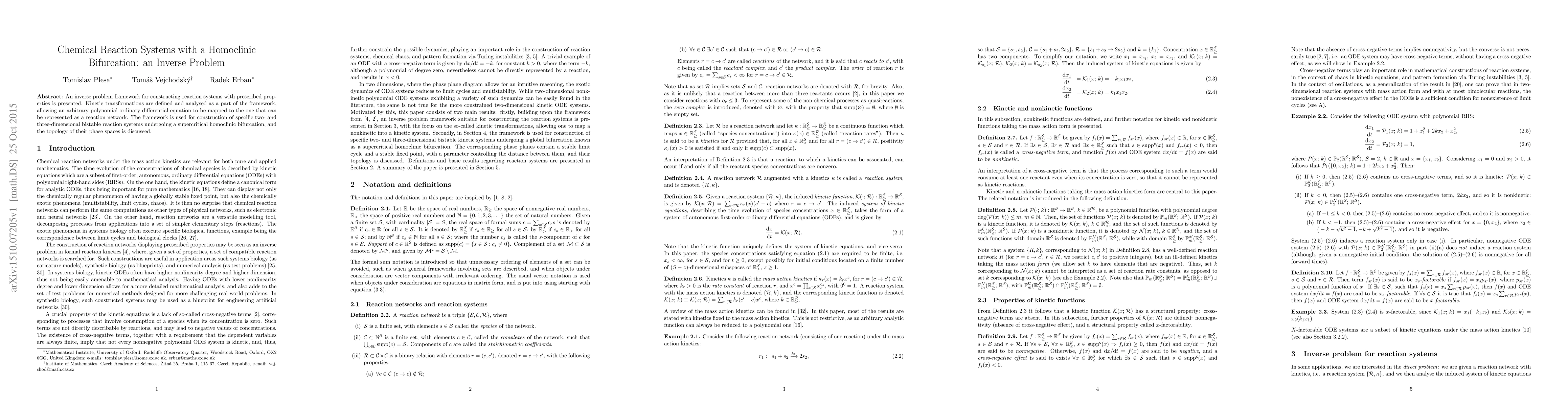 An inverse problem framework for constructing reaction systems with prescribed properties is presented. Kinetic transformations are defined and analysed as a part of the framework, allowing an arbitrary polynomial ordinary differential equation to be mapped to the one that can be represented as a reaction network. The framework is used for construction of specific two- and three-dimensional bistable reaction systems undergoing a supercritical homoclinic bifurcation, and the topology of their phase spaces is discussed.