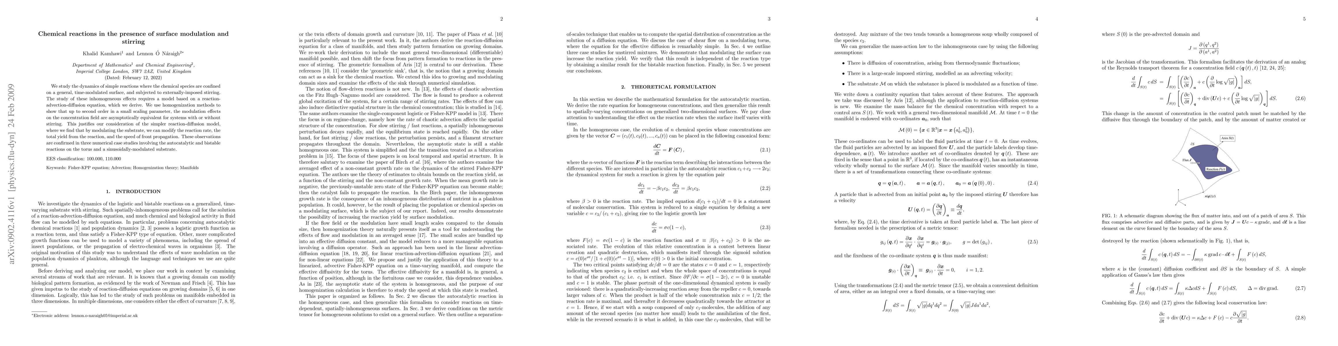 We study the dynamics of simple reactions where the chemical species are confined on a general, time-modulated surface, and subjected to externally-imposed stirring. The study of these inhomogeneous effects requires a model based on a reaction-advection-diffusion equation, which we derive. We use homogenization methods to show that up to second order in a small scaling parameter, the modulation effects on the concentration field are asymptotically equivalent for systems with or without stirring. This justifies our consideration of the simpler reaction-diffusion model, where we find that by modulating the substrate, we can modify the reaction rate, the total yield from the reaction, and the speed of front propagation. These observations are confirmed in three numerical case studies involving the autocatalytic and bistable reactions on the torus and a sinusoidally-modulated substrate