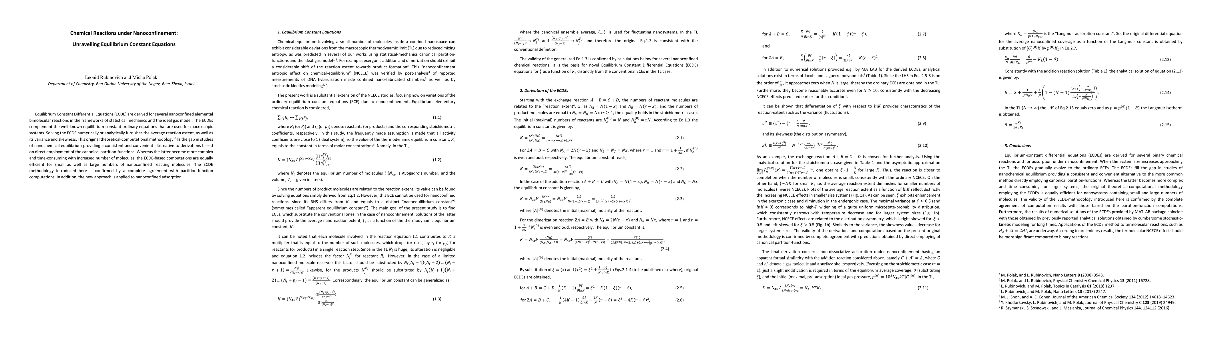 This paper derives Equilibrium Constant Differential Equations (ECDE) for nanoconfined bimolecular reactions, offering a simpler alternative to canonical partition-function methods. The ECDEs provide numerical or analytical solutions for reaction extent, variance, and skewness, validated by agreement with partition-function computations and applied to nanoconfined adsorption.