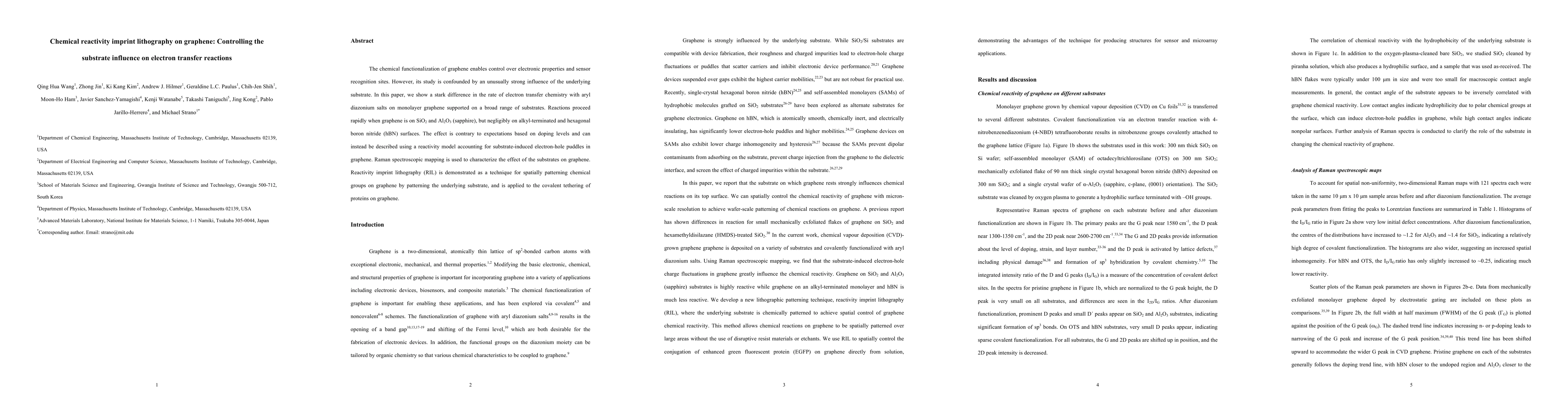 This paper demonstrates that chemical reactivity imprint lithography (RIL) can control electron transfer reactions on graphene by manipulating substrate influence, revealing significant differences in reaction rates based on substrate materials, and introducing RIL for spatially patterning chemical groups on graphene.