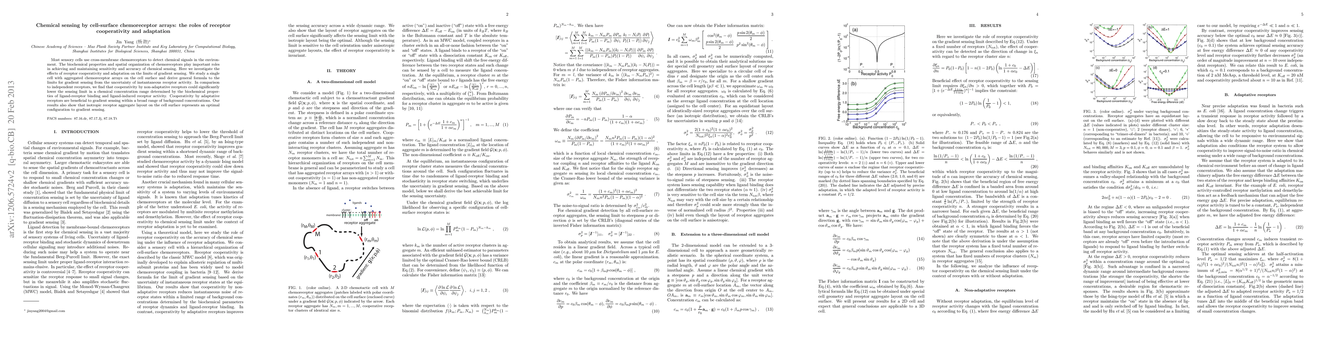 This paper explores the impact of receptor cooperativity and adaptation on chemical sensing by cell-surface chemoreceptor arrays, finding that cooperative non-adaptive receptors can significantly lower sensing limits within specific concentration ranges, while adaptive receptors enhance gradient sensing across a broad concentration spectrum. An isotropic receptor layout is identified as optimal for gradient sensing.