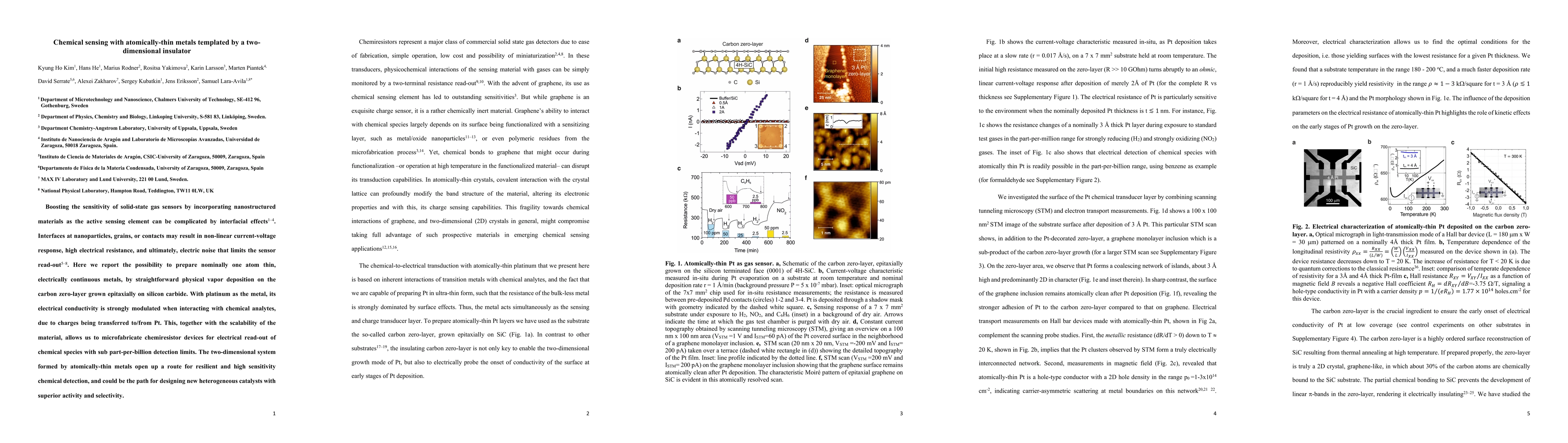 Boosting the sensitivity of solid-state gas sensors by incorporating nanostructured materials as the active sensing element can be complicated by interfacial effects. Interfaces at nanoparticles, grains, or contacts may result in non-linear current-voltage response, high electrical resistance, and ultimately, electric noise that limits the sensor read-out. Here we report the possibility to prepare nominally one atom thin, electrically continuous metals, by straightforward physical vapor deposition on the carbon zero-layer grown epitaxially on silicon carbide. With platinum as the metal, its electrical conductivity is strongly modulated when interacting with chemical analytes, due to charges being transferred to/from Pt. This, together with the scalability of the material, allows us to microfabricate chemiresistor devices for electrical read-out of chemical species with sub part-per-billion detection limits. The two-dimensional system formed by atomically-thin metals open up a route for resilient and high sensitivity chemical detection, and could be the path for designing new heterogeneous catalysts with superior activity and selectivity.