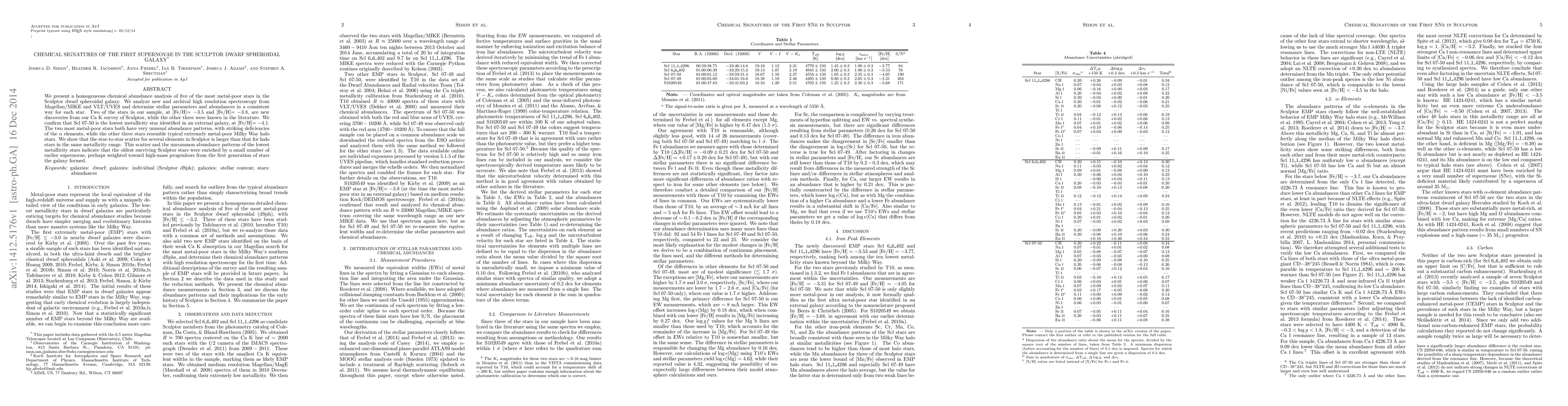 The study presents a homogeneous chemical abundance analysis of five metal-poor stars in the Sculptor dwarf spheroidal galaxy using high-resolution spectroscopy from Magellan/MIKE and VLT/UVES, determining stellar parameters and abundances consistently for each star.