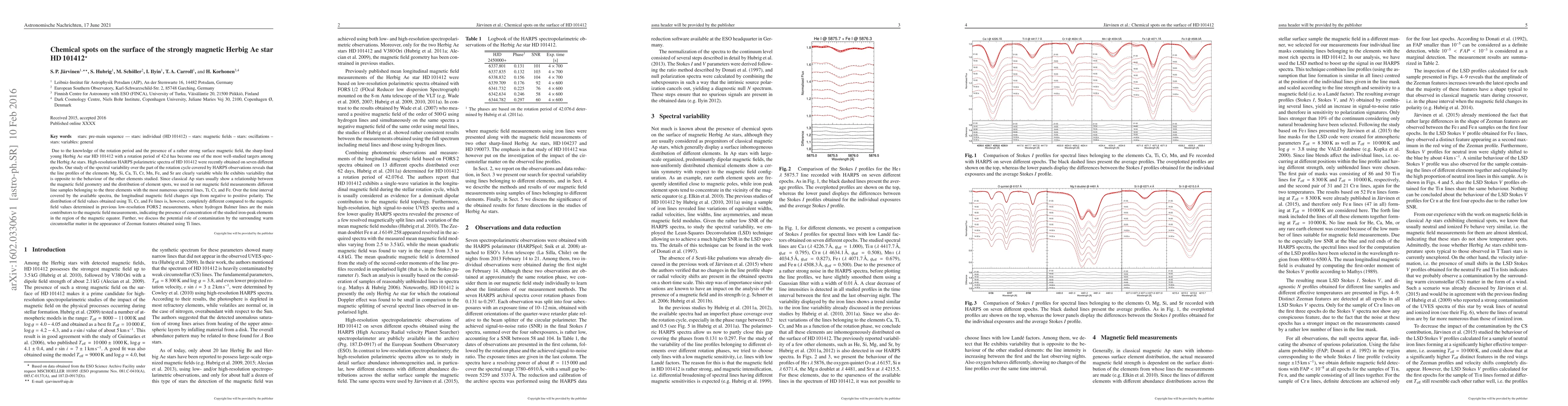 Due to the knowledge of the rotation period and the presence of a rather strong surface magnetic field, the sharp-lined young Herbig Ae star HD 101412 with a rotation period of 42 d has become one of the most well-studied targets among the Herbig Ae stars. High-resolution HARPS polarimetric spectra of HD 101412 were recently obtained on seven different epochs. Our study of the spectral variability over the part of the rotation cycle covered by HARPS observations reveals that the line profiles of the elements Mg, Si, Ca, Ti, Cr, Mn, Fe, and Sr are clearly variable while He exhibits variability that is opposite to the behaviour of the other elements studied. Since classical Ap stars usually show a relationship between the magnetic field geometry and the distribution of element spots, we used in our magnetic field measurements different line samples belonging to the three elements with the most numerous spectral lines, Ti, Cr, and Fe. Over the time interval covered by the available spectra, the longitudinal magnetic field changes sign from negative to positive polarity. The distribution of field values obtained using Ti, Cr, and Fe lines is, however, completely different compared to the magnetic field values determined in previous low-resolution FORS 2 measurements, where hydrogen Balmer lines are the main contributors to the magnetic field measurements, indicating the presence of concentration of the studied iron-peak elements in the region of the magnetic equator. Further, we discuss the potential role of contamination by the surrounding warm circumstellar matter in the appearance of Zeeman features obtained using Ti lines.