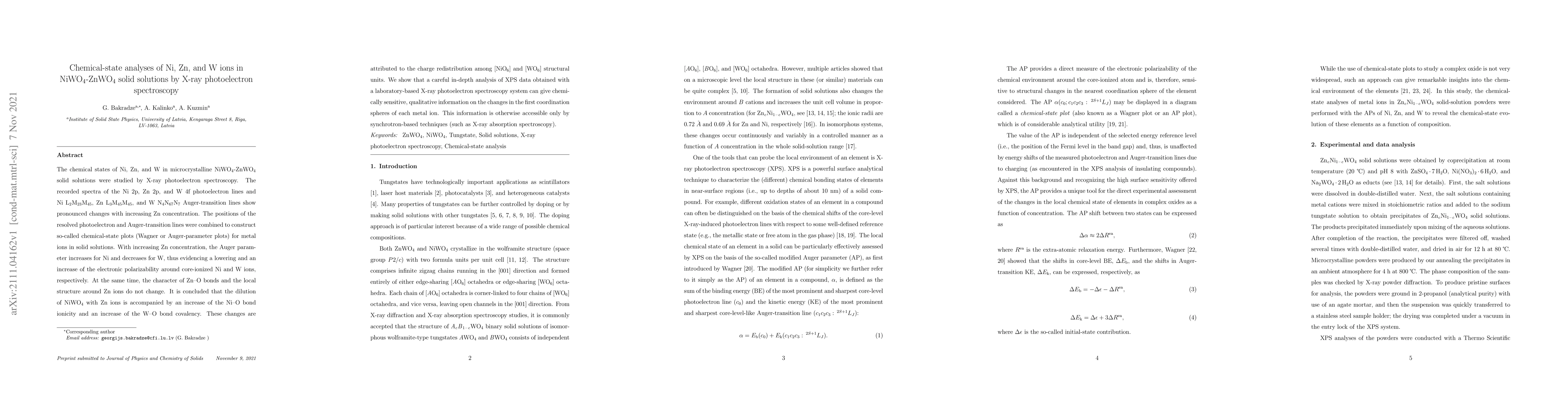 The chemical states of Ni, Zn, and W in microcrystalline NiWO$_4$-ZnWO$_4$ solid solutions were studied by X-ray photoelectron spectroscopy. The recorded spectra of the Ni 2p, Zn 2p, and W 4f photoelectron lines and Ni L$_2$M$_{23}$M$_{45}$, Zn L$_3$M$_{45}$M$_{45}$, and W N$_4$N$_{67}$N$_{7}$ Auger-transition lines show pronounced changes with increasing Zn concentration. The positions of the resolved photoelectron and Auger-transition lines were combined to construct so-called chemical-state plots (Wagner or Auger-parameter plots) for metal ions in solid solutions. With increasing Zn concentration, the Auger parameter increases for Ni and decreases for W, thus evidencing a lowering and an increase of the electronic polarizability around core-ionized Ni and W ions, respectively. At the same time, the character of Zn-O bonds and the local structure around Zn ions do not change. It is concluded that the dilution of NiWO$_4$ with Zn ions is accompanied by an increase of the Ni-O bond ionicity and an increase of the W-O bond covalency. These changes are attributed to the charge redistribution among [NiO$_6$] and [WO$_6$] structural units. We show that a careful in-depth analysis of XPS data obtained with a laboratory-based X-ray photoelectron spectroscopy system can give chemically sensitive, qualitative information on the changes in the first coordination spheres of each metal ion. This information is otherwise accessible only by synchrotron-based techniques (such as X-ray absorption spectroscopy).