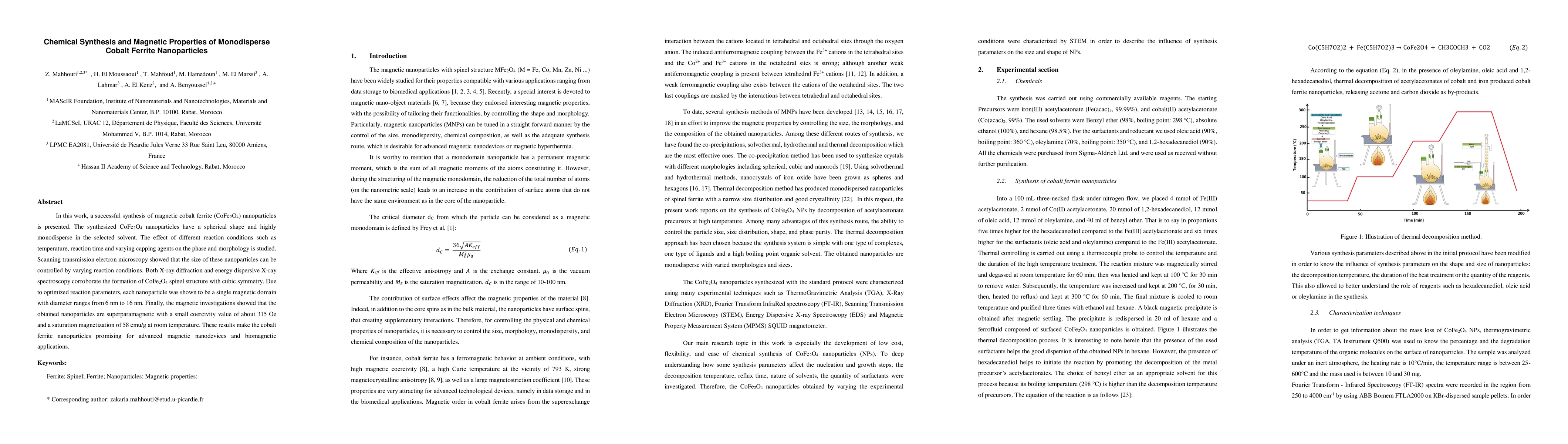 This paper presents the synthesis of monodisperse cobalt ferrite nanoparticles (CoFe2O4) with controlled size and superparamagnetic properties, achieved through varying reaction conditions. The nanoparticles exhibit a spinel structure and are suitable for advanced magnetic applications due to their small coercivity and high saturation magnetization.