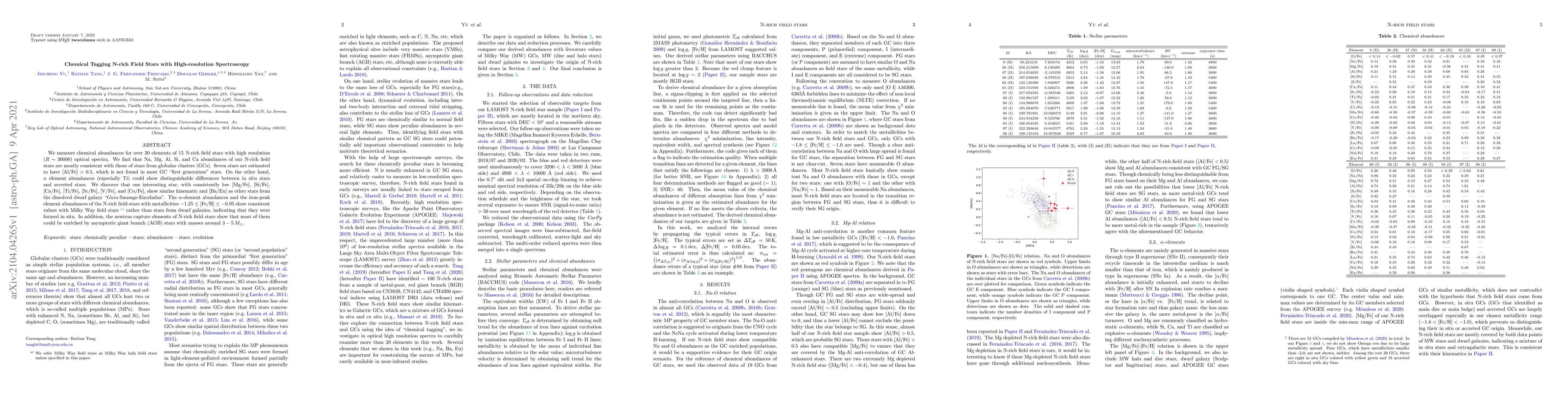 We measure chemical abundances for over 20 elements of 15 N-rich field stars with high resolution ($R \sim 30000$) optical spectra. We find that Na, Mg, Al, Si, and Ca abundances of our N-rich field stars are mostly consistent with those of stars from globular clusters (GCs). Seven stars are estimated to have [Al/Fe$]>0.5$, which is not found in most GC "first generation" stars. On the other hand, $\alpha$ element abundances (especially Ti) could show distinguishable differences between in situ stars and accreted stars. We discover that one interesting star, with consistently low [Mg/Fe], [Si/Fe], [Ca/Fe], [Ti/Fe], [Sc/Fe], [V/Fe], and [Co/Fe], show similar kinematic and [Ba/Eu] as other stars from the dissolved dwarf galaxy "$Gaia$-Sausage-Enceladus". The $\alpha$-element abundances and the iron-peak element abundances of the N-rich field stars with metallicities $-1.25 \le {\rm [Fe/H]} \le -0.95$ show consistent values with Milky Way field stars rather than stars from dwarf galaxies, indicating that they were formed in situ. In addition, the neutron capture elements of N-rich field stars show that most of them could be enriched by asymptotic giant branch (AGB) stars with masses around $3 - 5\, M_{\odot}$.