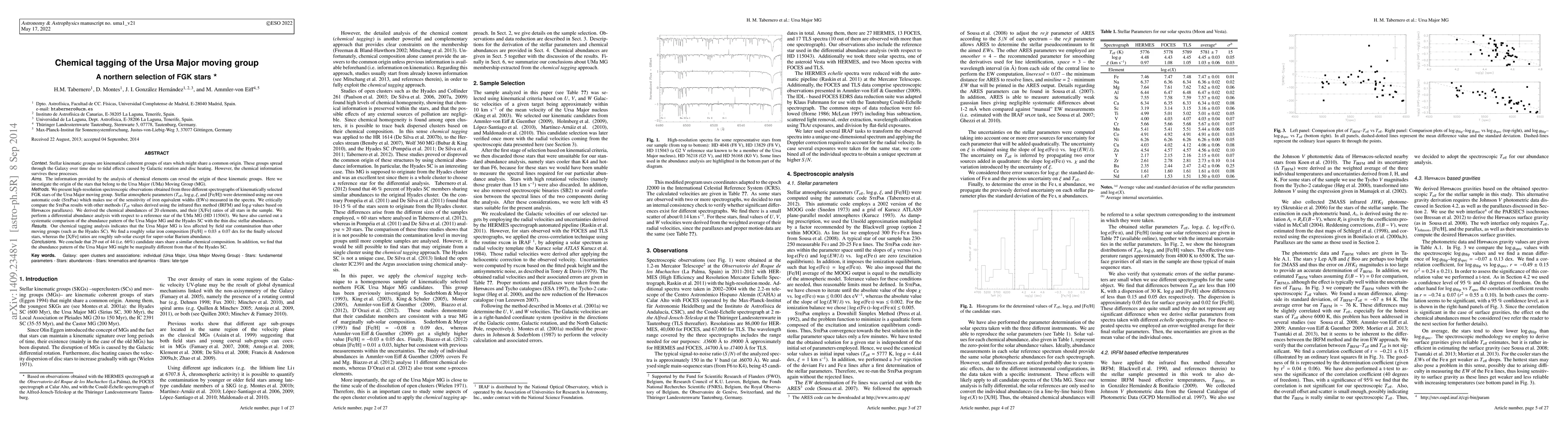 This research investigates the chemical composition of stars in the Ursa Major Moving Group (UMa MG) to determine their origin. High-resolution spectroscopy reveals that 66% of the selected stars share a similar chemical makeup, suggesting a common origin. The analysis shows a roughly solar iron composition but sub-solar [X/Fe] ratios, except for super-solar barium, indicating minimal field star contamination.