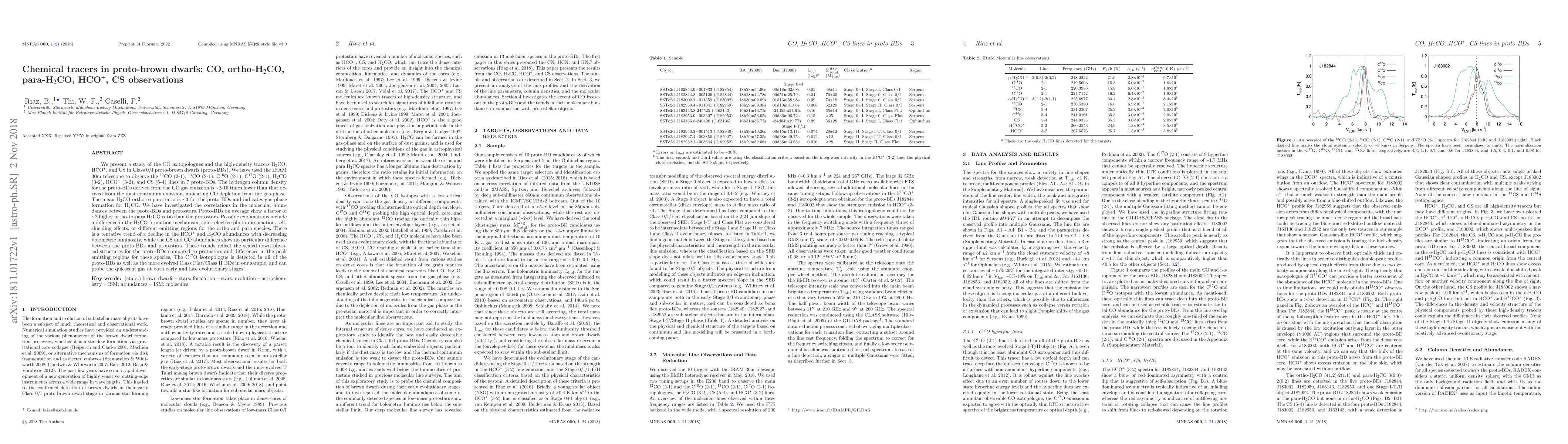 We present a study of the CO isotopologues and the high-density tracers H$_{2}$CO, HCO$^{+}$, and CS in Class 0/I proto-brown dwarfs (proto-BDs). We have used the IRAM 30m telescope to observe the $^{12}$CO (2-1), $^{13}$CO (2-1), C$^{18}$O (2-1), C$^{17}$O (2-1), H$_{2}$CO (3-2), HCO$^{+}$ (3-2), and CS (5-4) lines in 7 proto-BDs. The hydrogen column density for the proto-BDs derived from the CO gas emission is $\sim$2-15 times lower than that derived from the dust continuum emission, indicating CO depletion from the gas-phase. The mean H$_{2}$CO ortho-to-para ratio is $\sim$3 for the proto-BDs and indicates gas-phase formation for H$_{2}$CO. We have investigated the correlations in the molecular abundances between the proto-BDs and protostars. Proto-BDs on average show a factor of $\sim$2 higher ortho-to-para H$_{2}$CO ratio than the protostars. Possible explanations include a difference in the H$_{2}$CO formation mechanism, spin-selective photo-dissociation, self-shielding effects, or different emitting regions for the ortho and para species. There is a tentative trend of a decline in the HCO$^{+}$ and H$_{2}$CO abundances with decreasing bolometric luminosity, while the CS and CO abundances show no particular difference between the proto-BDs and protostars. These trends reflect the scaled-down physical structures for the proto-BDs compared to protostars and differences in the peak emitting regions for these species. The C$^{17}$O isotopologue is detected in all of the proto-BDs as well as the more evolved Class Flat/Class II BDs in our sample, and can probe the quiescent gas at both early and late evolutionary stages.