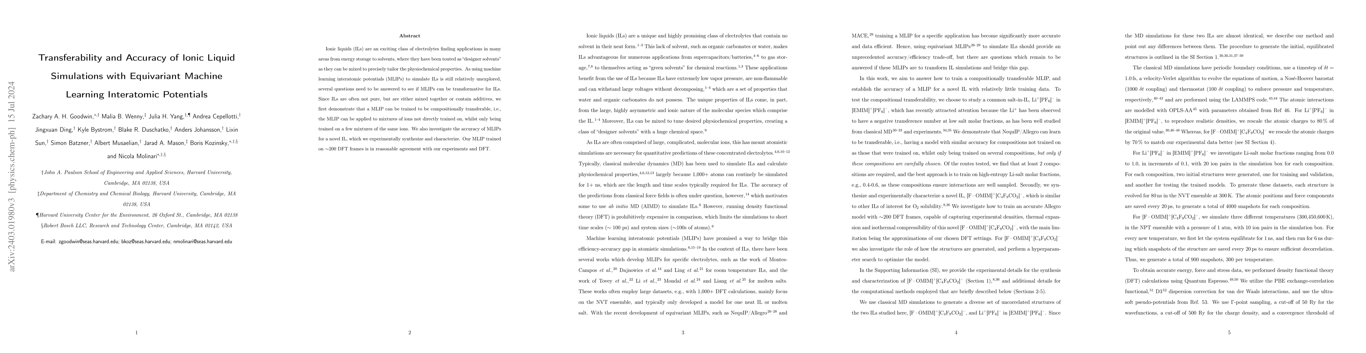 This research explores the use of machine learning interatomic potentials (MLIPs) to simulate ionic liquids (ILs), demonstrating their chemical transferability and accuracy. The study trains MLIPs on a limited number of compositions and shows they can predict properties for novel ILs, achieving reasonable experimental agreement and good density functional theory (DFT) alignment.