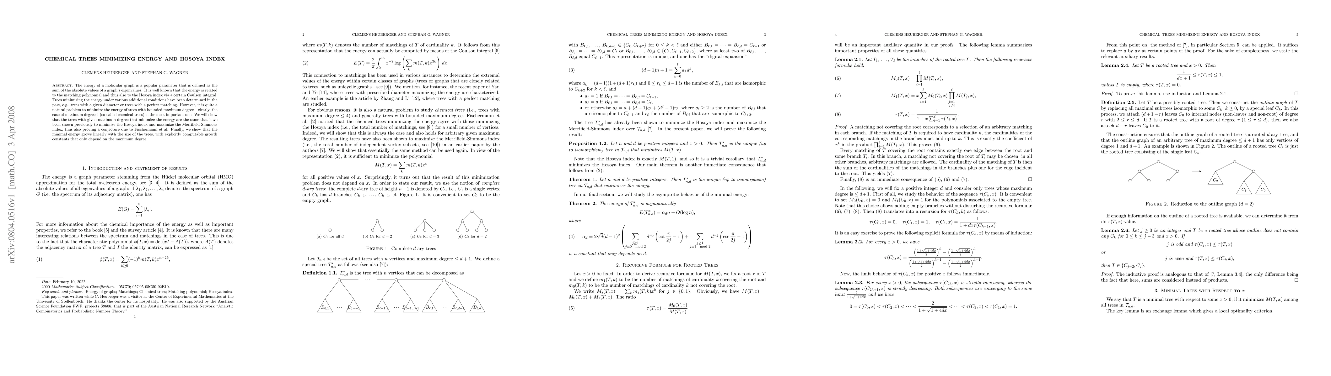 This paper investigates trees minimizing both the energy and Hosoya index for chemical trees with bounded maximum degree. It demonstrates that trees minimizing energy under these conditions also minimize the Hosoya index and maximize the Merrifield-Simmons index, thus confirming a conjecture by Fischermann et al. Additionally, it shows that minimal energy grows linearly with the tree size, with growth constants dependent on the maximum degree.