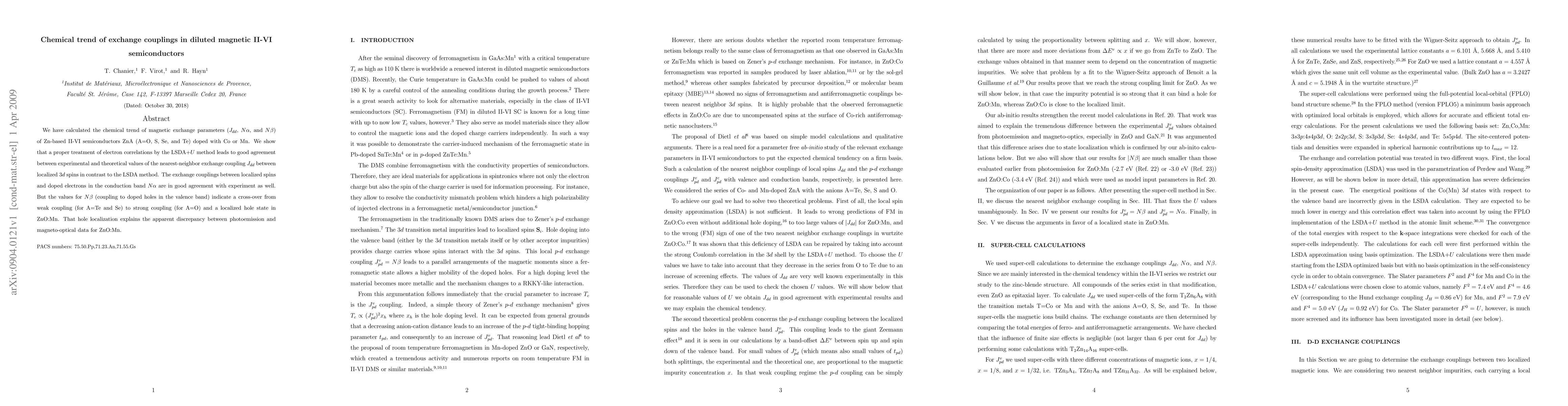 We have calculated the chemical trend of magnetic exchange parameters ($J_{dd}$, $N \alpha$, and $N \beta$) of Zn-based II-VI semiconductors ZnA (A=O, S, Se, and Te) doped with Co or Mn. We show that a proper treatment of electron correlations by the LSDA+$U$ method leads to good agreement between experimental and theoretical values of the nearest-neighbor exchange coupling $J_{dd}$ between localized 3$d$ spins in contrast to the LSDA method. The exchange couplings between localized spins and doped electrons in the conduction band $N \alpha$ are in good agreement with experiment as well. But the values for $N \beta$ (coupling to doped holes in the valence band) indicate a cross-over from weak coupling (for A=Te and Se) to strong coupling (for A=O) and a localized hole state in ZnO:Mn. That hole localization explains the apparent discrepancy between photoemission and magneto-optical data for ZnO:Mn.